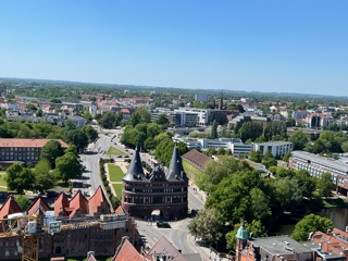 Nun sind wir gemeinsam in die Stadt gegangen, um dort den Turm der St Petri Kirche zu besichtigen. Wir gingen alle gemeinsam zum Aufzug und genossen daraufhin den wunderschönen Ausblick auf Lübeck.