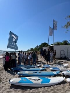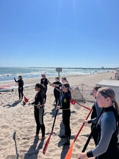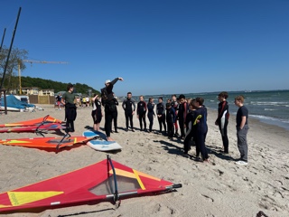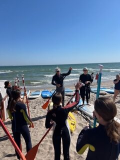Am vorletzten Tag unseres Austausches trafen wir uns am Hauptbahnhof in Lübeck und fuhren dann mit dem Zug nach Timmendorfer Strand. Wenige Minuten später erreichten wir die Surf & SUP-Schule. Vor Ort wurden uns Neoprenanzüge gegeben und wir wurden in zwei Gruppen geteilt. Die eine begann mit dem Windsurfen, die die zweite mit dem Stand-Up paddeln.