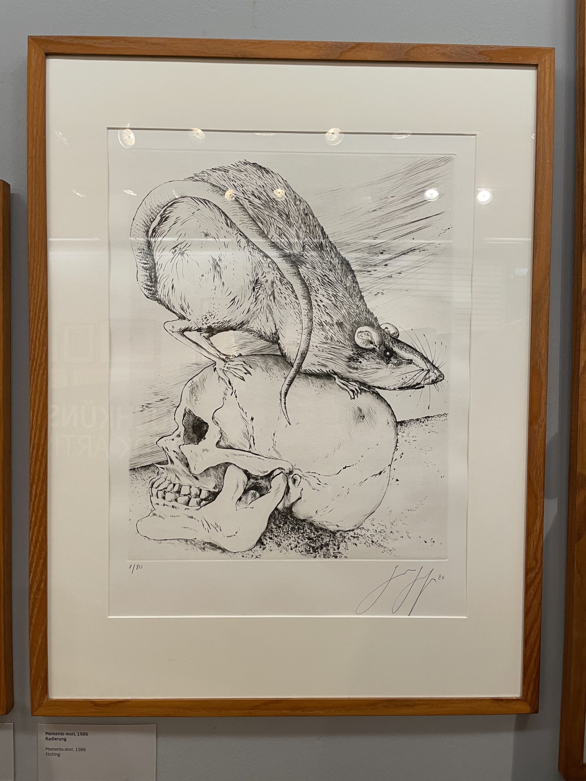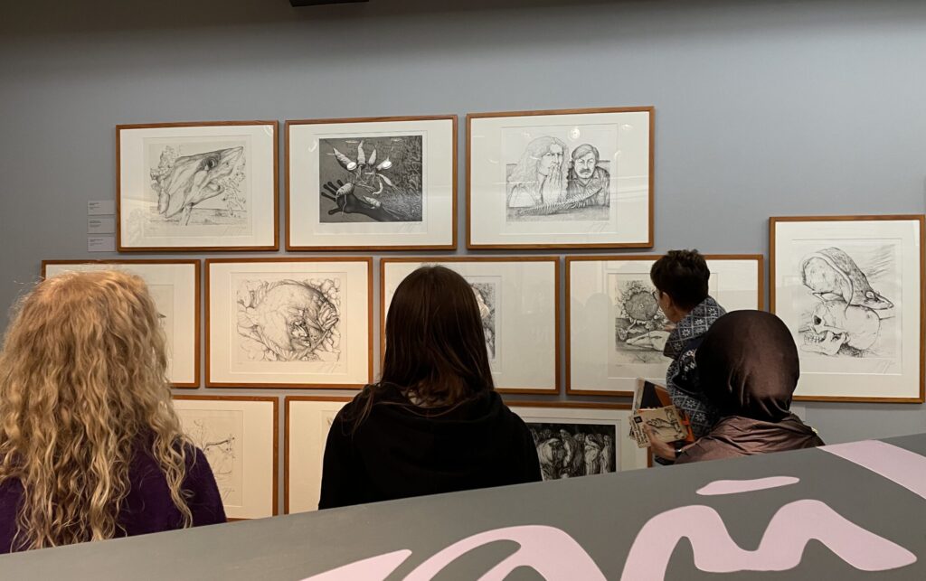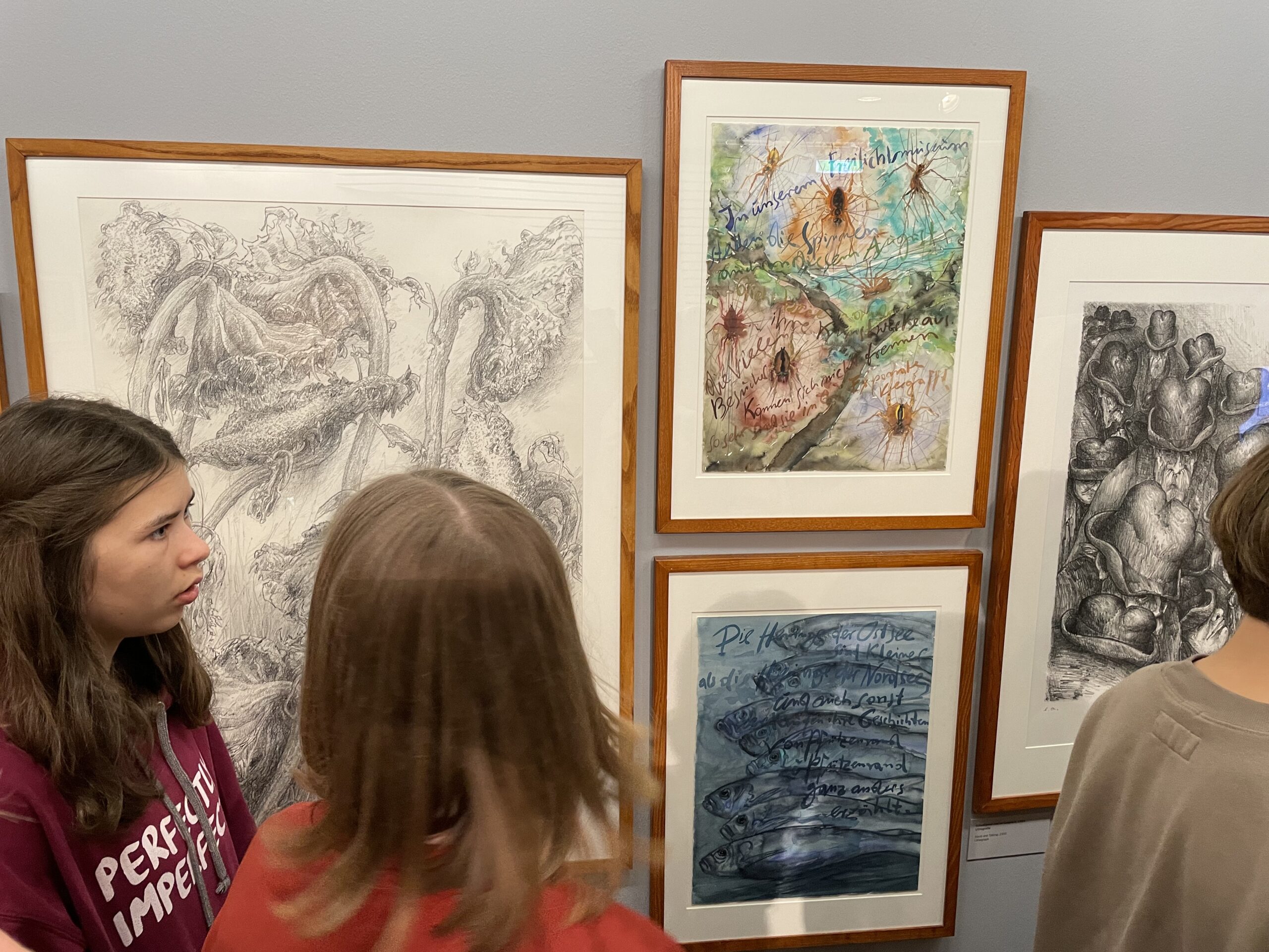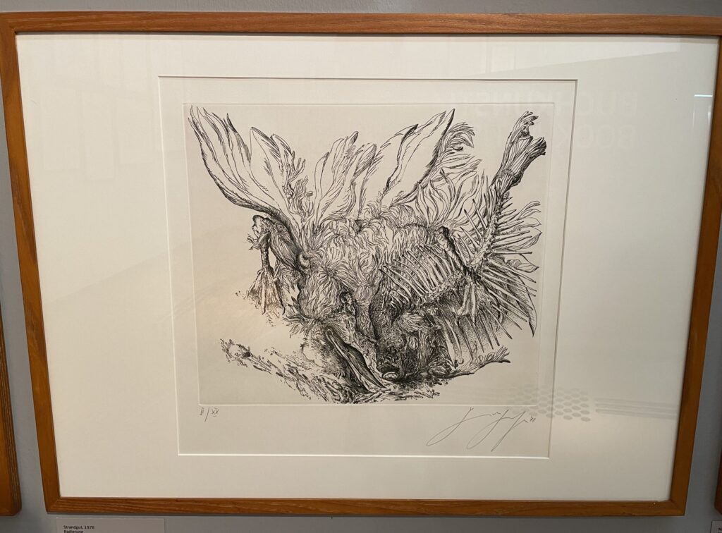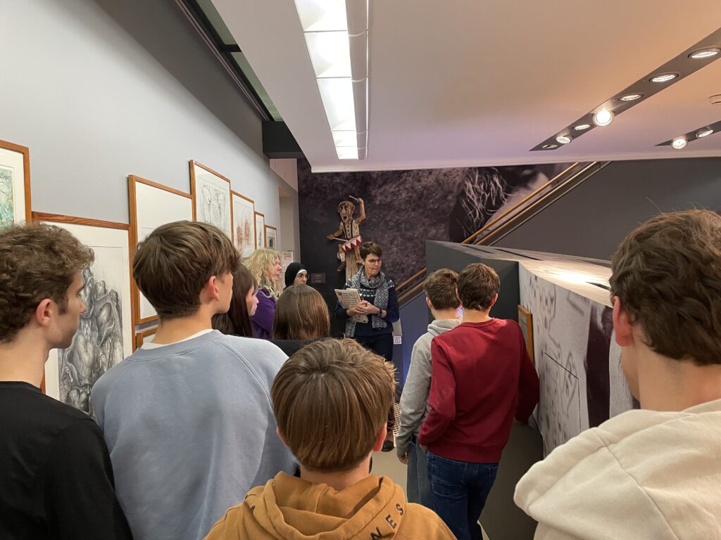 Bevor es für uns zu Bryan Adams geht, führt uns Frau Häckermann erst einmal durch die Dauerausstellung über Günter Grass. Wir lernen etwas über Grass ́ literarisches Werk, sein Talent als Zeichner, seine Jugend im Nationalsozialismus, die er immer wieder in seinen Schriften thematisiert. Die Motive der Zeichnungen, wirken auf den ersten Blick sehr unterschiedlich. Fischköpfe, gammelnde Pilze und verwesende Vögel – alles nebeneinander. Was alle Motive verbindet, ist ihr Bezug zur Vergänglichkeit, ein Thema, das Günter Grass sehr interessierte.