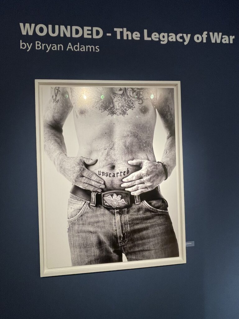Und dann ist da noch die Serie „Wounded – The Legacy of War“; für viele von uns der Höhepunkt. Während Günter Grass in seinem Roman der Butt sagte: “Was übrig bleibt, schreibe ich auf“, hält Bryan Adams es durch Fotos fest. Indem er in seiner Fotoserie stark verletzte und verwundete britische Kriegsveteranen fotografiert, hält er fest, was der Krieg mit ihnen gemacht hat. Die Beeinträchtigungen der Soldaten und Soldatinnen sind höchstwahrscheinlich sowohl mit starken physischen als auch psychischen Schmerzen verbunden; und dennoch strahlen die Fotografierten einen großen Lebenswillen und eine starke Verbundenheit mit ihrem Land aus.
