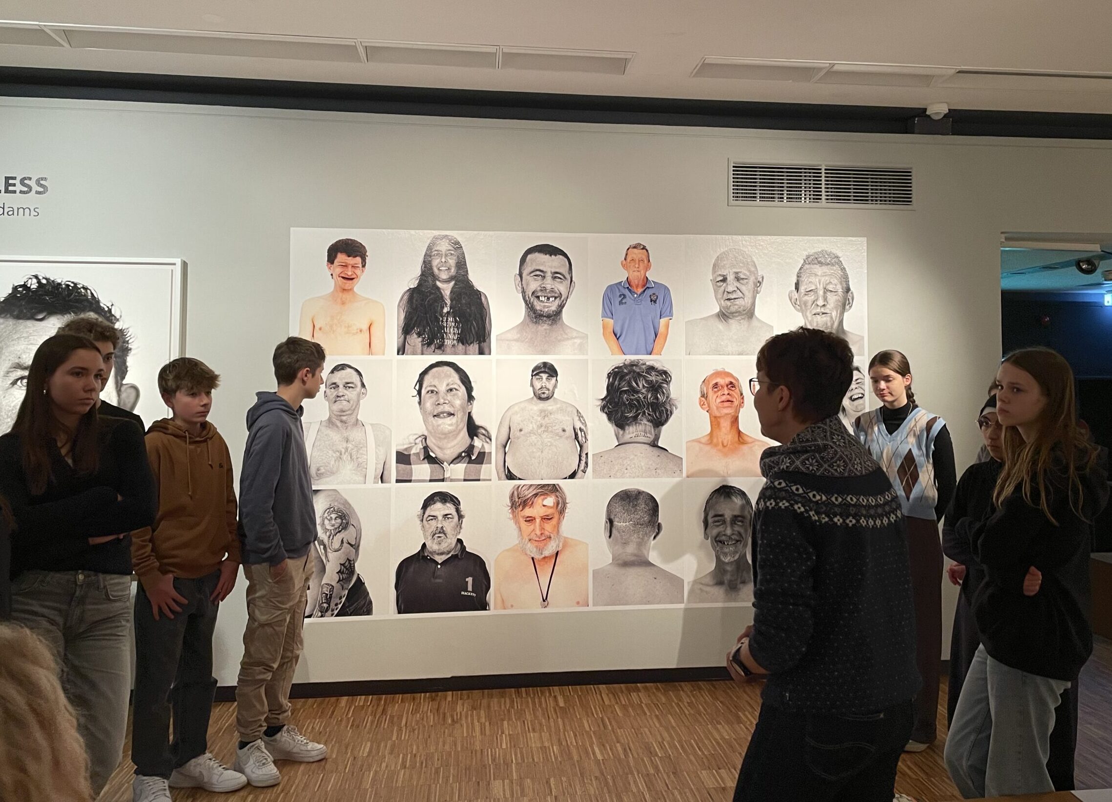 Auf der anderen Seite des Raumes schauen uns Portraits obdachloser Menschen entgegen. Viele haben nicht mal ein T-Shirt an. Ihre Gesichter und Körper sind von dem Leben auf der Straße gezeichnet, welches nicht so sorgenfrei, einfach und farbenfroh wirkt.