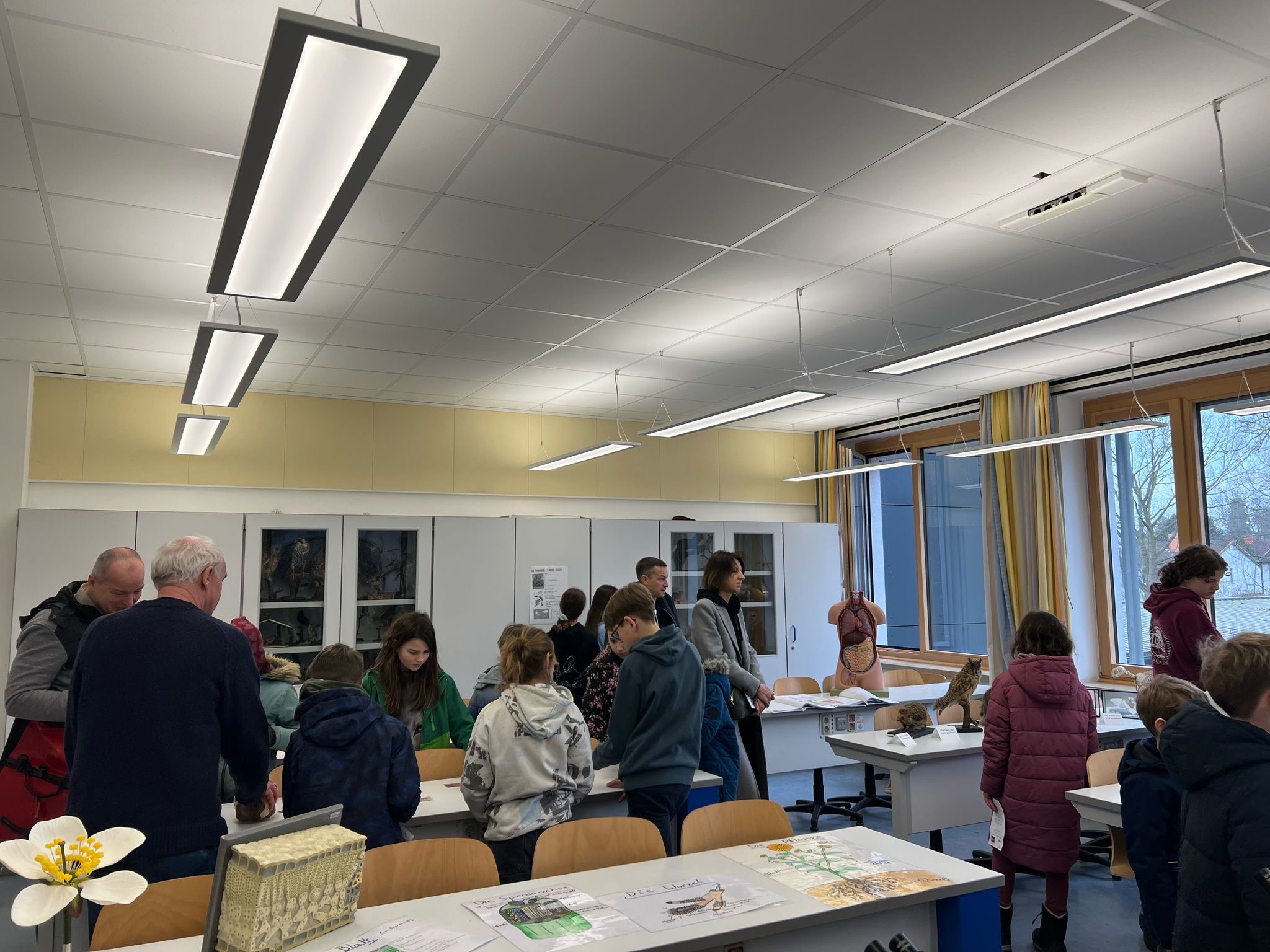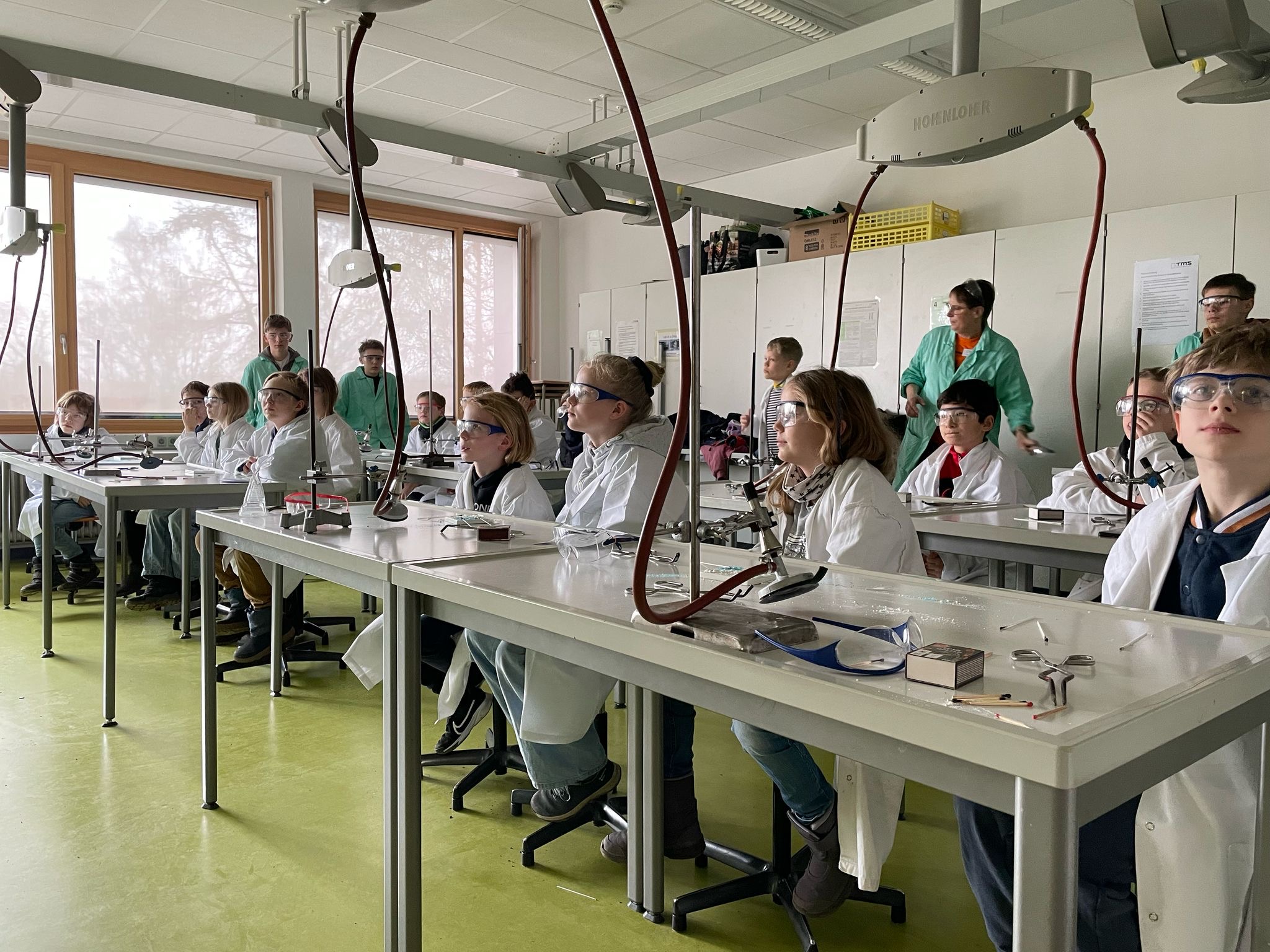 Worum geht es im Fach Biologie? Im Fachraum stellten unsere Schüler den Neulingen anhand von Modellen den Verdauungstrakt des Menschen und die Sprossachse bei Pflanzen vor. Mit dem Mikroskop konnten sie Blattabschnitte untersuchen und den Zellaufbau studieren.