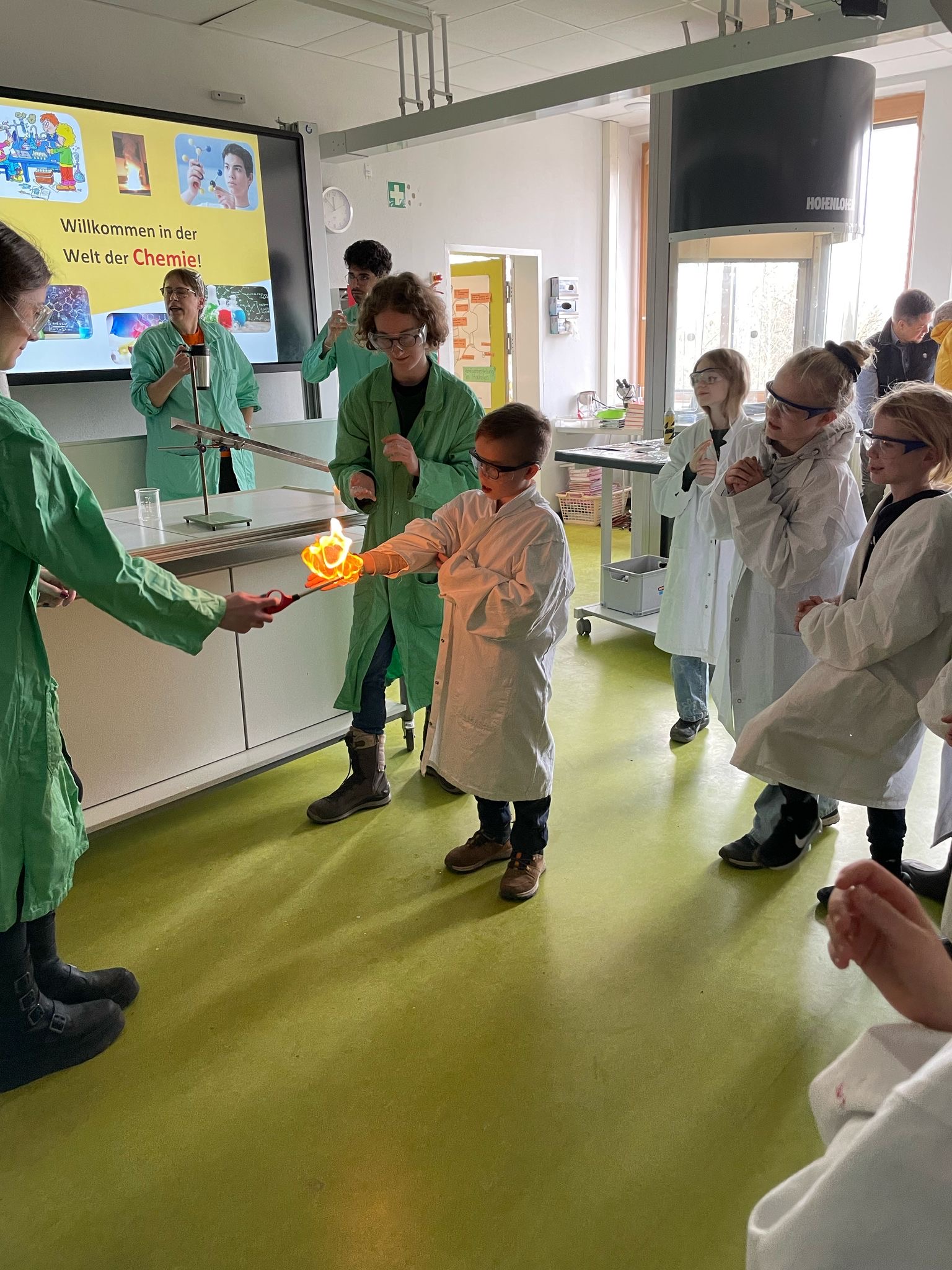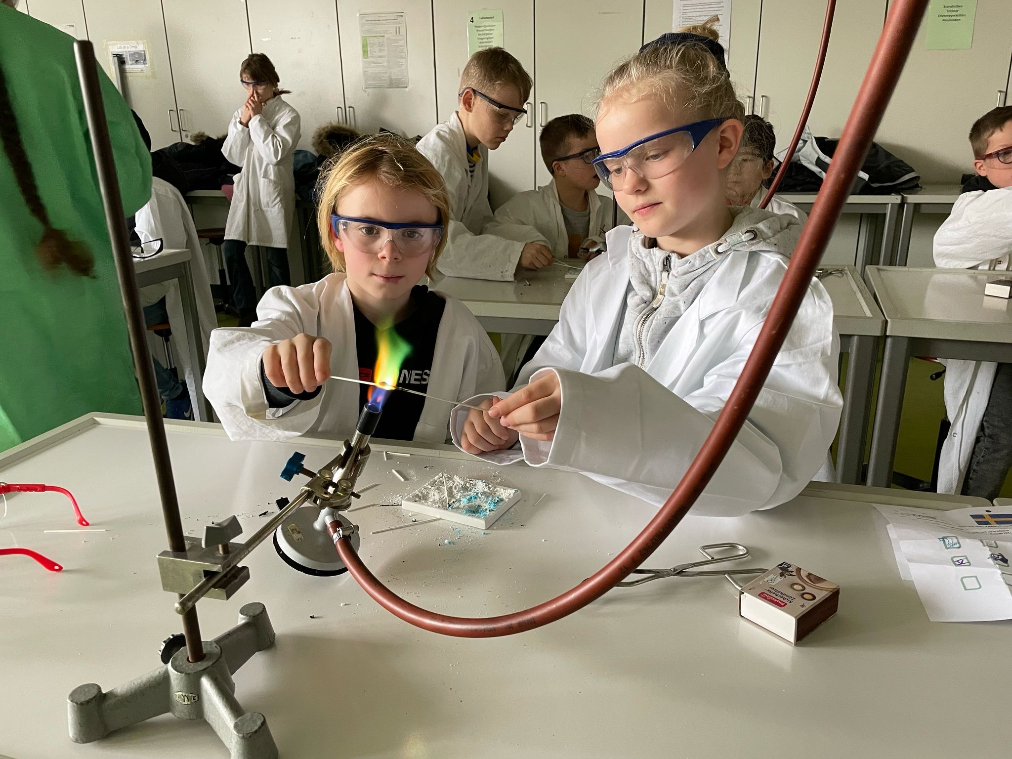 Carla und Lale führten beim Tag der offenen Tür die 4.-Klässler durchs Gebäude. Welche Station kam am besten an? Die einhellige Meinung war: der Chemieraum