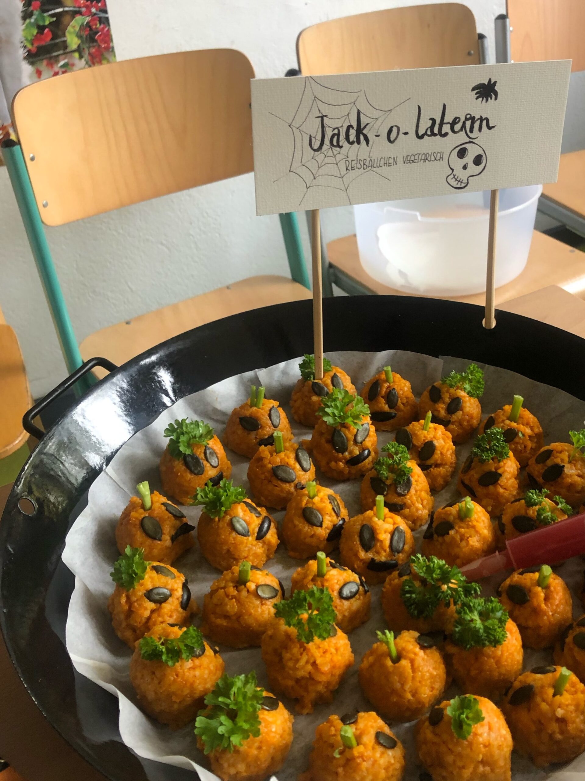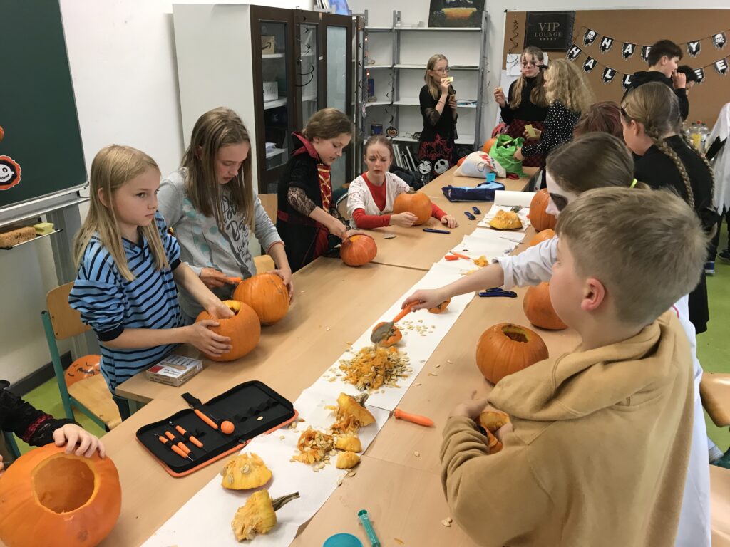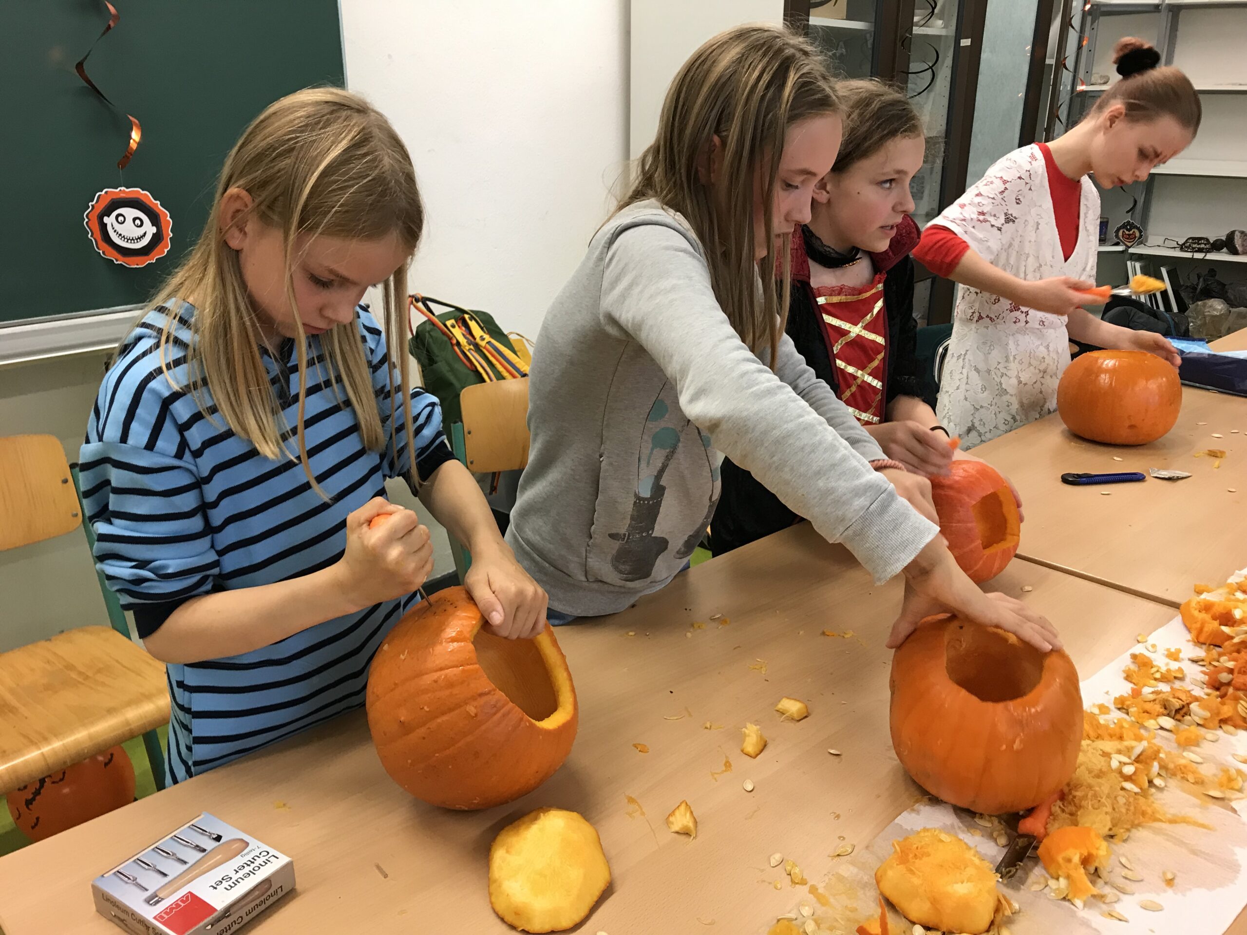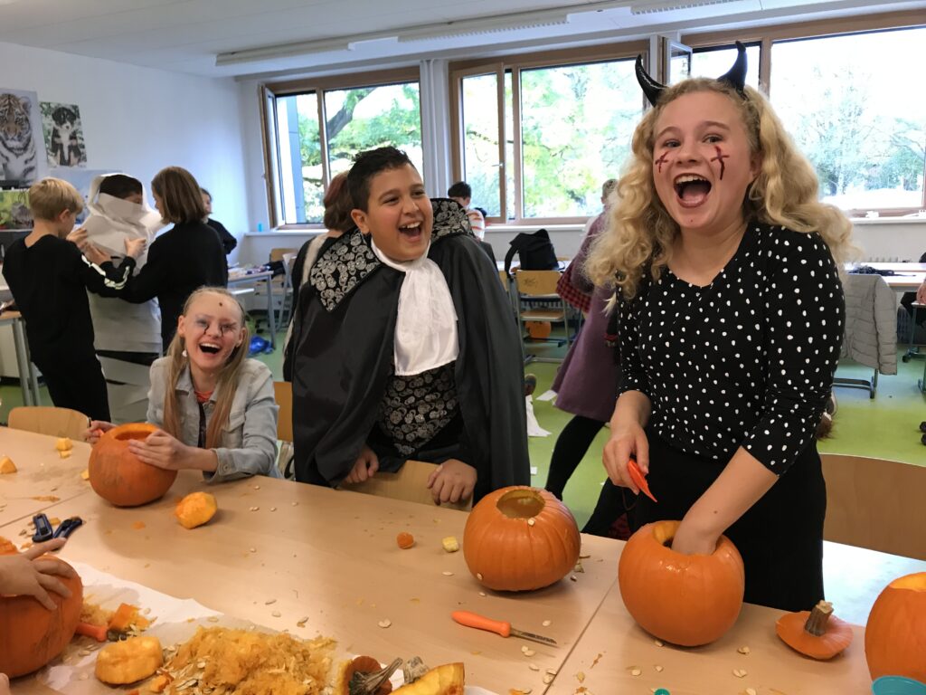 Sensenmänner, Skelette, Gruselpuppen, Königinnen der Nacht und Teufelinnen schmausten vergnügt, bevor sie ans Werk gingen und ihre Kürbisse aushöhlten und Fratzen hineinschnitten. Außerdem hatte Englischlehrerin Yvonne Fraatz eine Fühlkiste mit allerlei ekeligem, glitschigem und klebrigem Inhalt vorbereitet, deren Inhalt die Fantasie anregte und manch spitzen Schrei auslöste.
