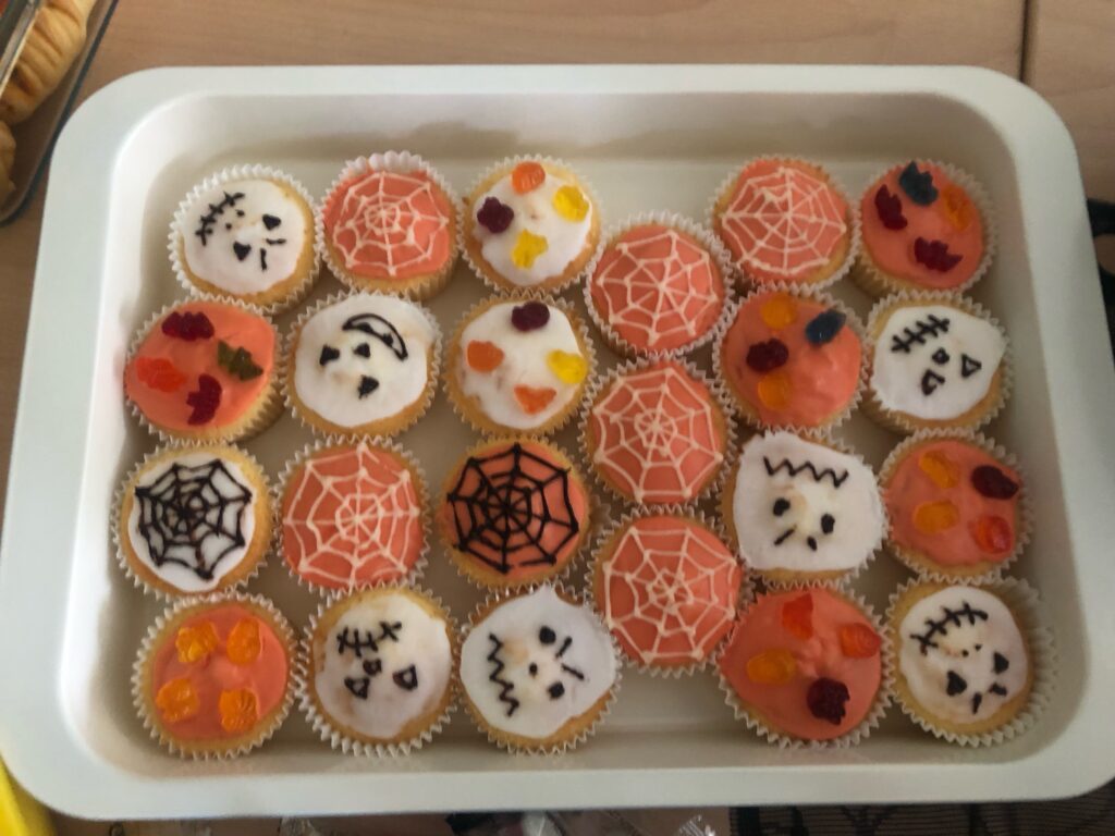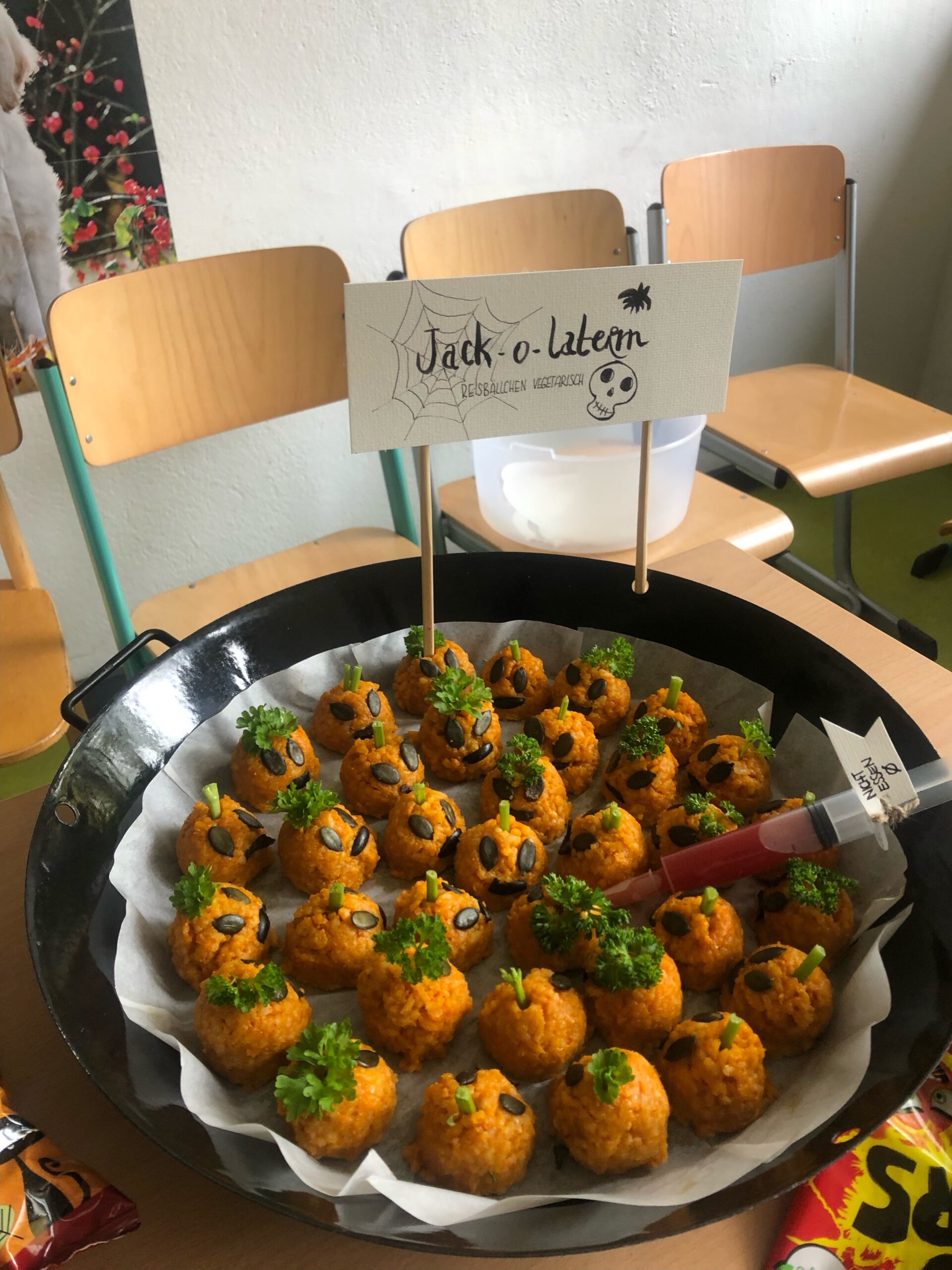Blutsuppe mit Glubschaugen, Spinnenmuffins und Gruselkekse – bei der Halloweenparty der Klasse 6d fehlte es nicht an schaurig schön verzierten und leckeren Naschereien. Die Eltern hatten sich einiges zum Motto der Party einfallen lassen und ihren Kindern mitgegeben.