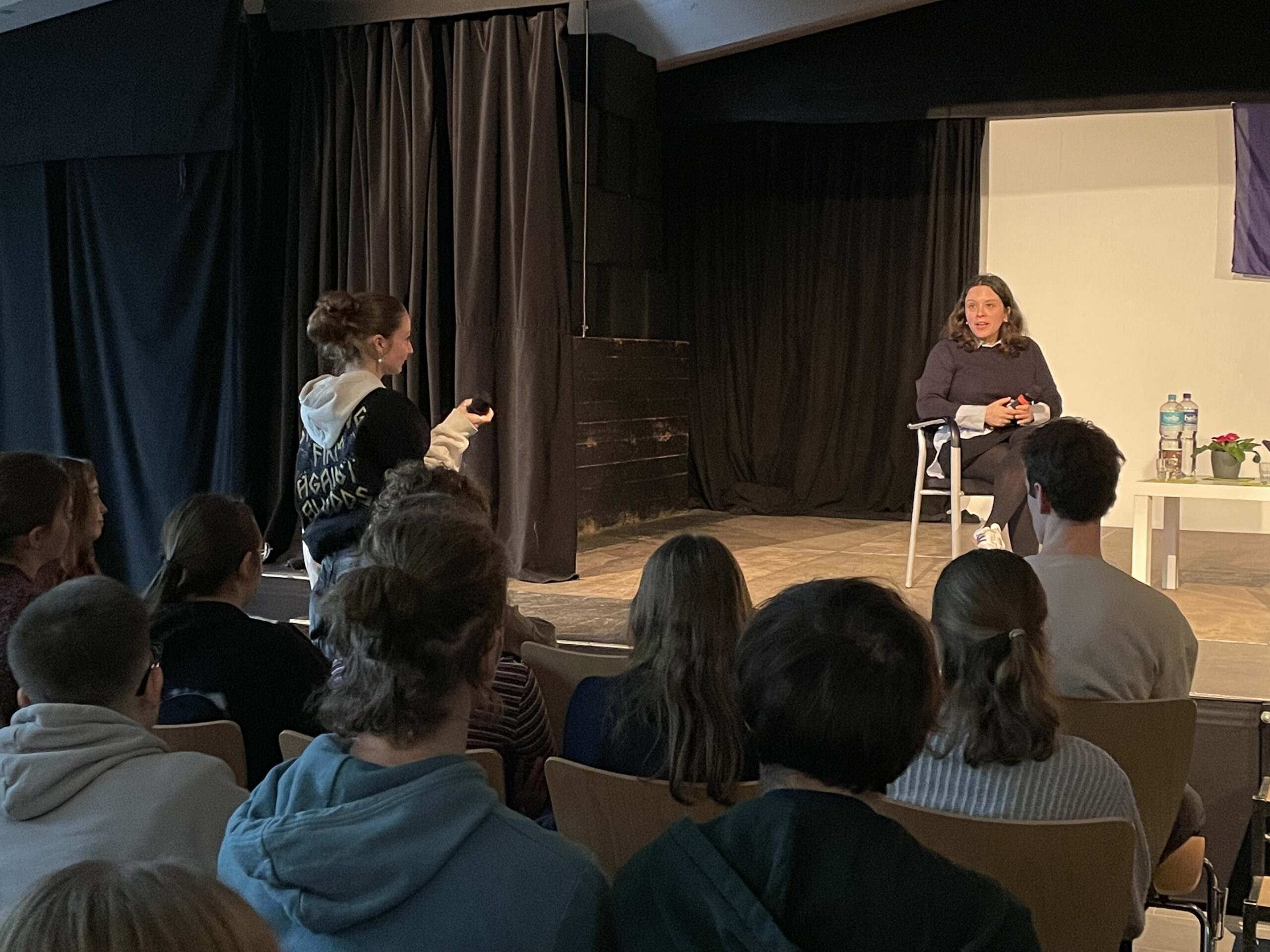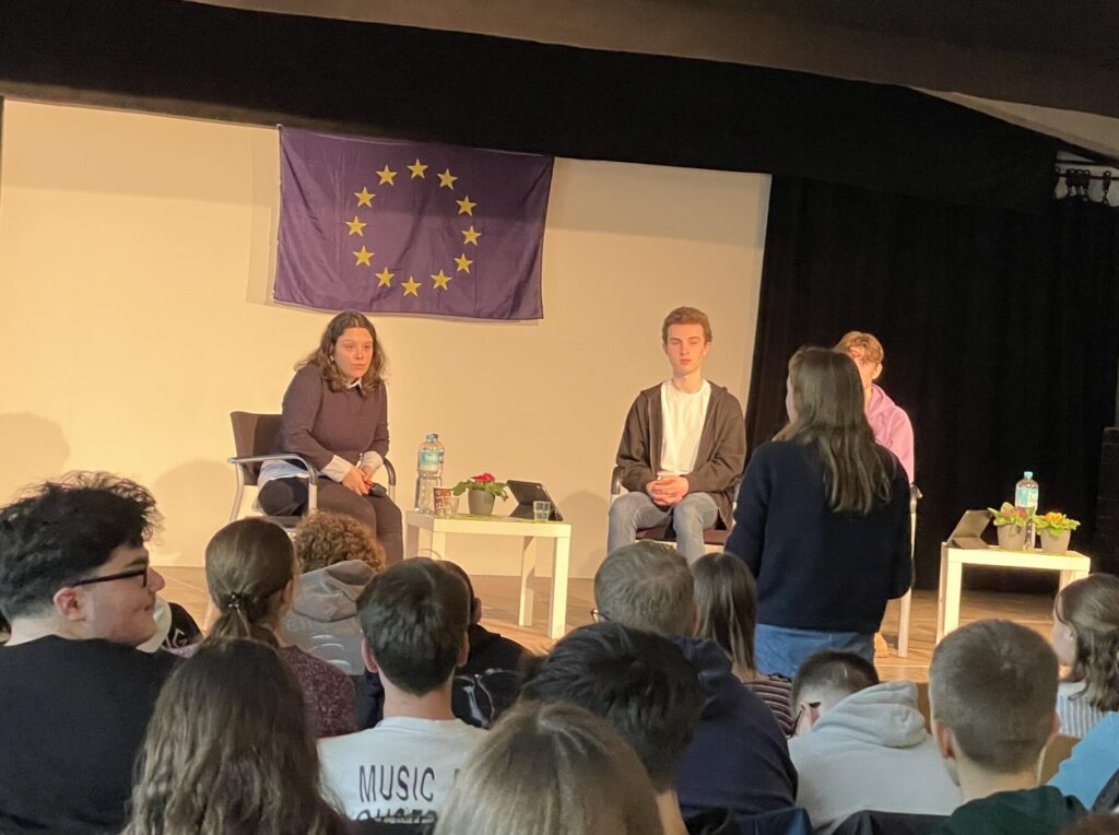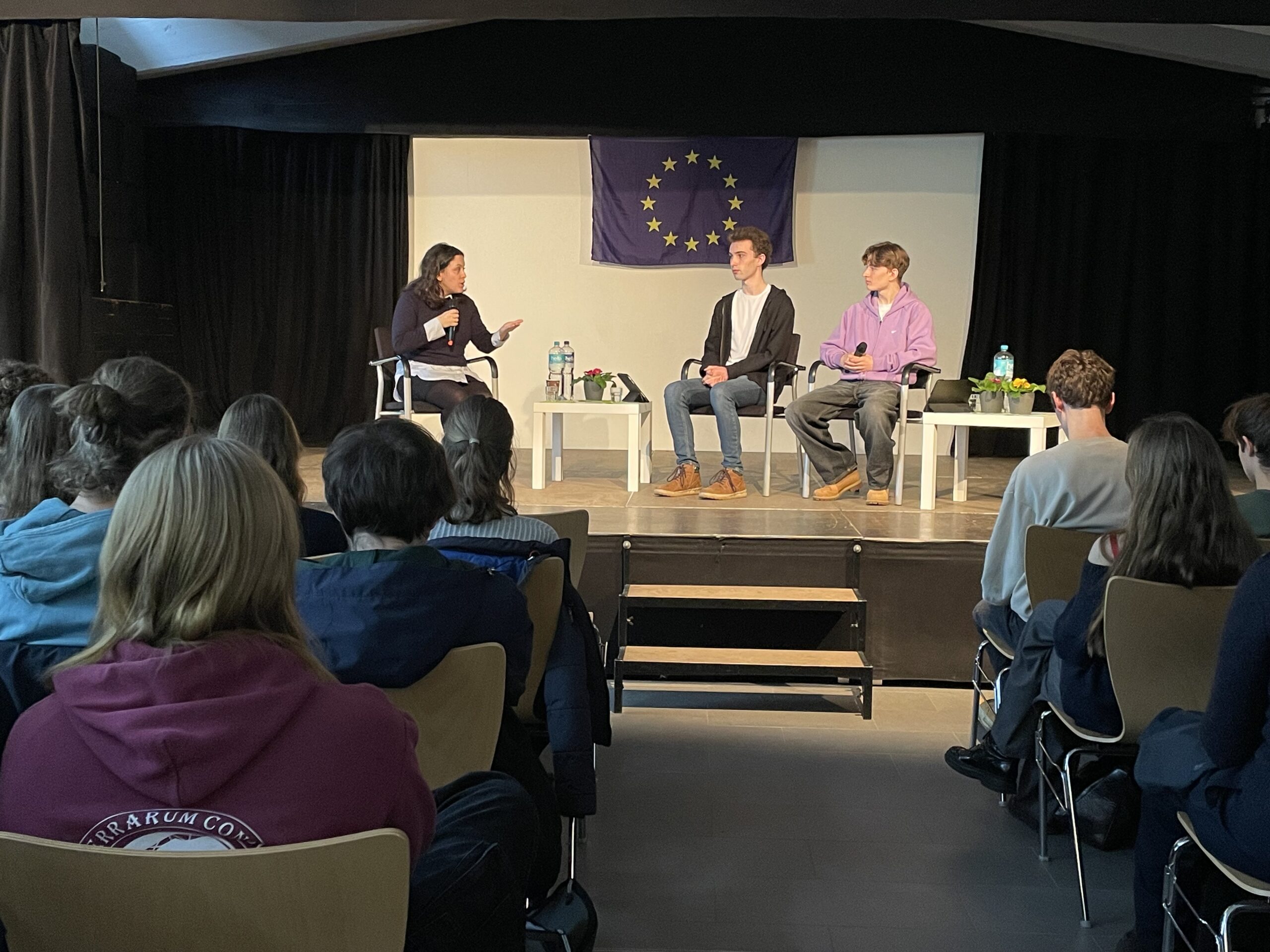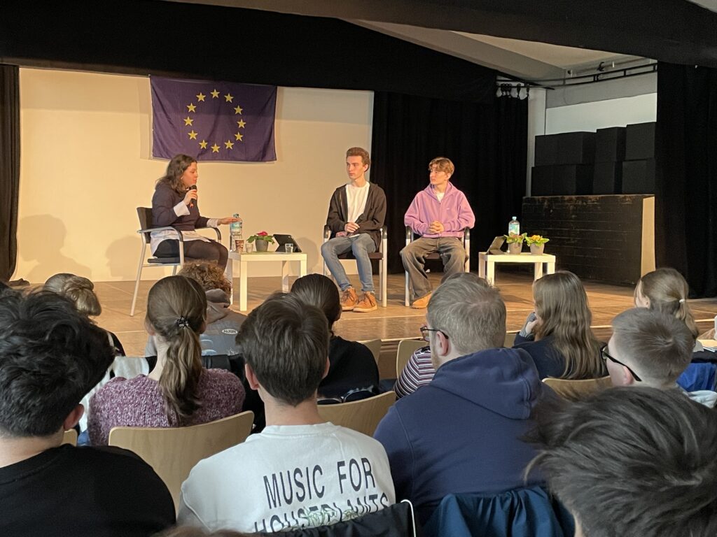 Unter diesem Thema stand der Besuch der Abgeordneten des Europäischen Parlaments Delara Burkhardt in der TMS. Die Schülerinnen und Schüler der Europa-AG hatten auf eigene Initiative hin die Politikerin angesprochen und Fragen an sie vorbereitet. Anton und Lucas moderierten die Veranstaltung.