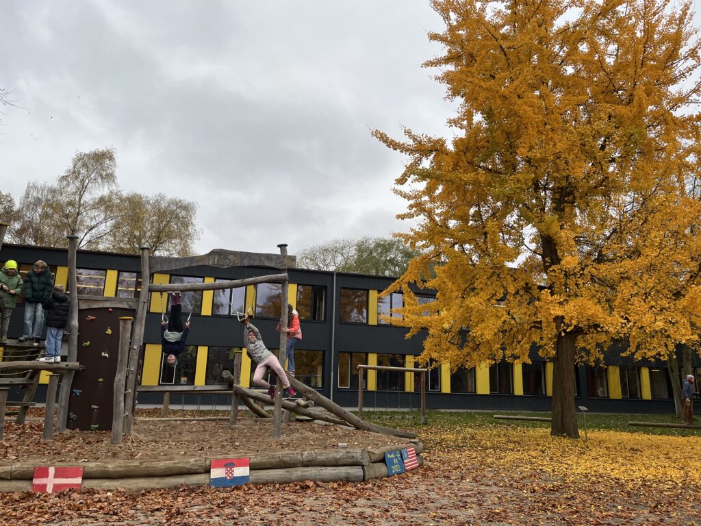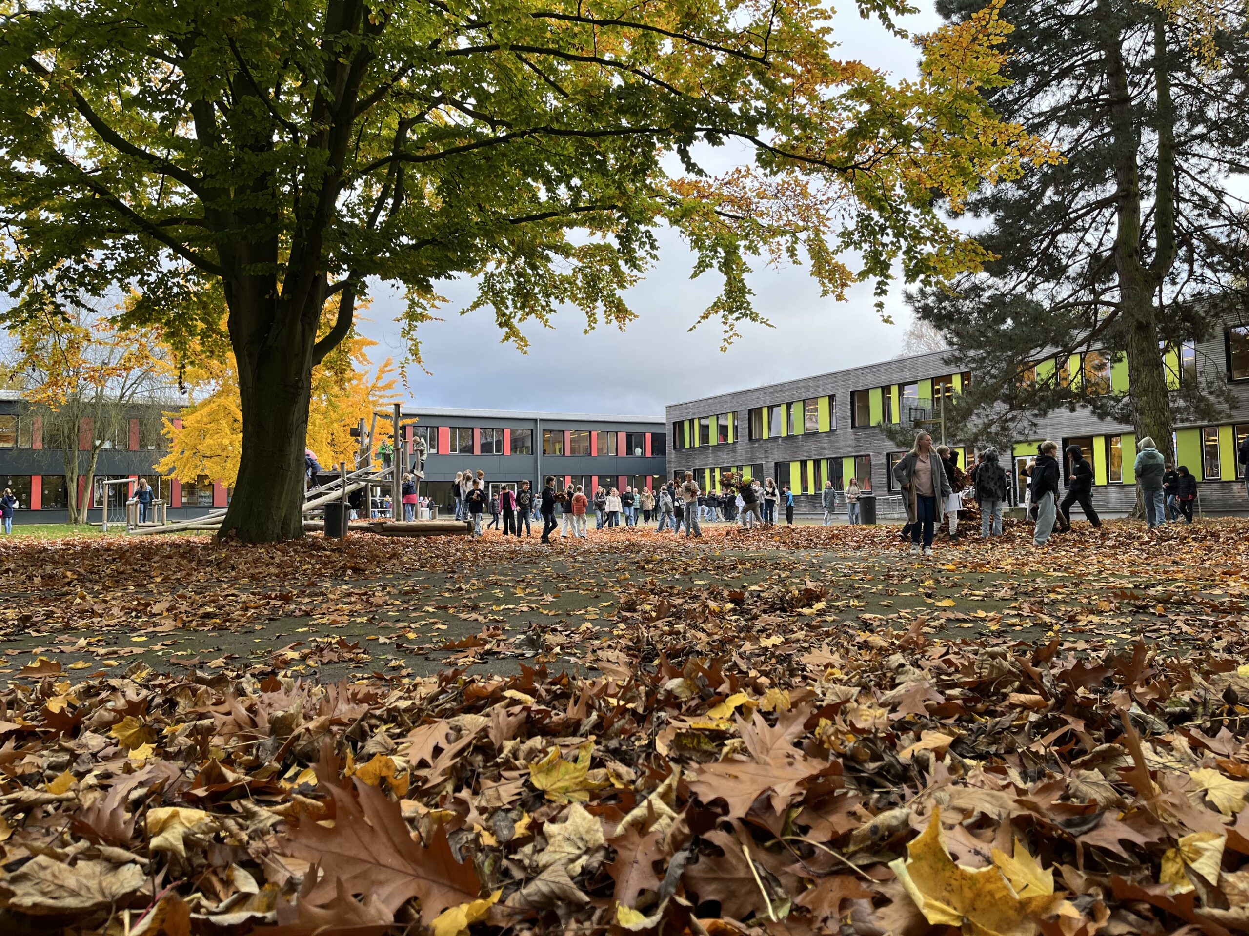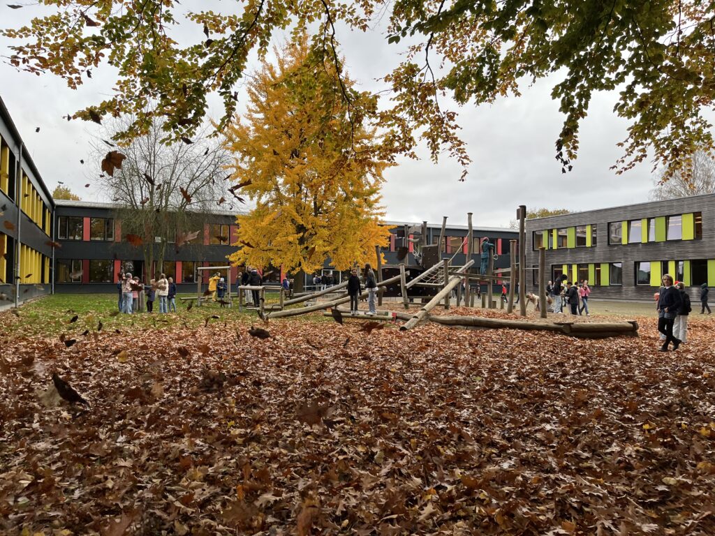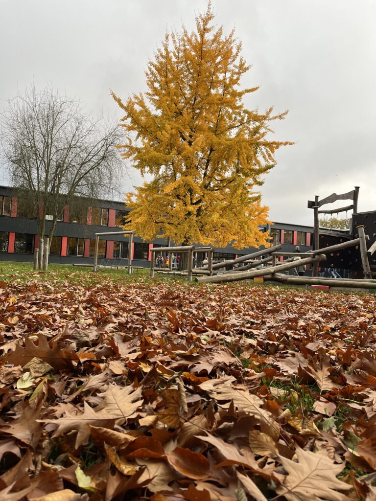Golden leuchtet das Laub des Gingko Biloba. Blätter, die eine Windböe von den Zweigen geklaubt hat, tänzeln zu Boden. Einige Fünftklässler pflügen mit ihren Stiefeln durch die Blätterberge. Dunkle Wolken ziehen über den Himmel und kündigen den nächsten Schauer an: Es ist Herbst geworden. Malte von der Journalismus-AG hat die die Stimmung mit der Kamera eingefangen: