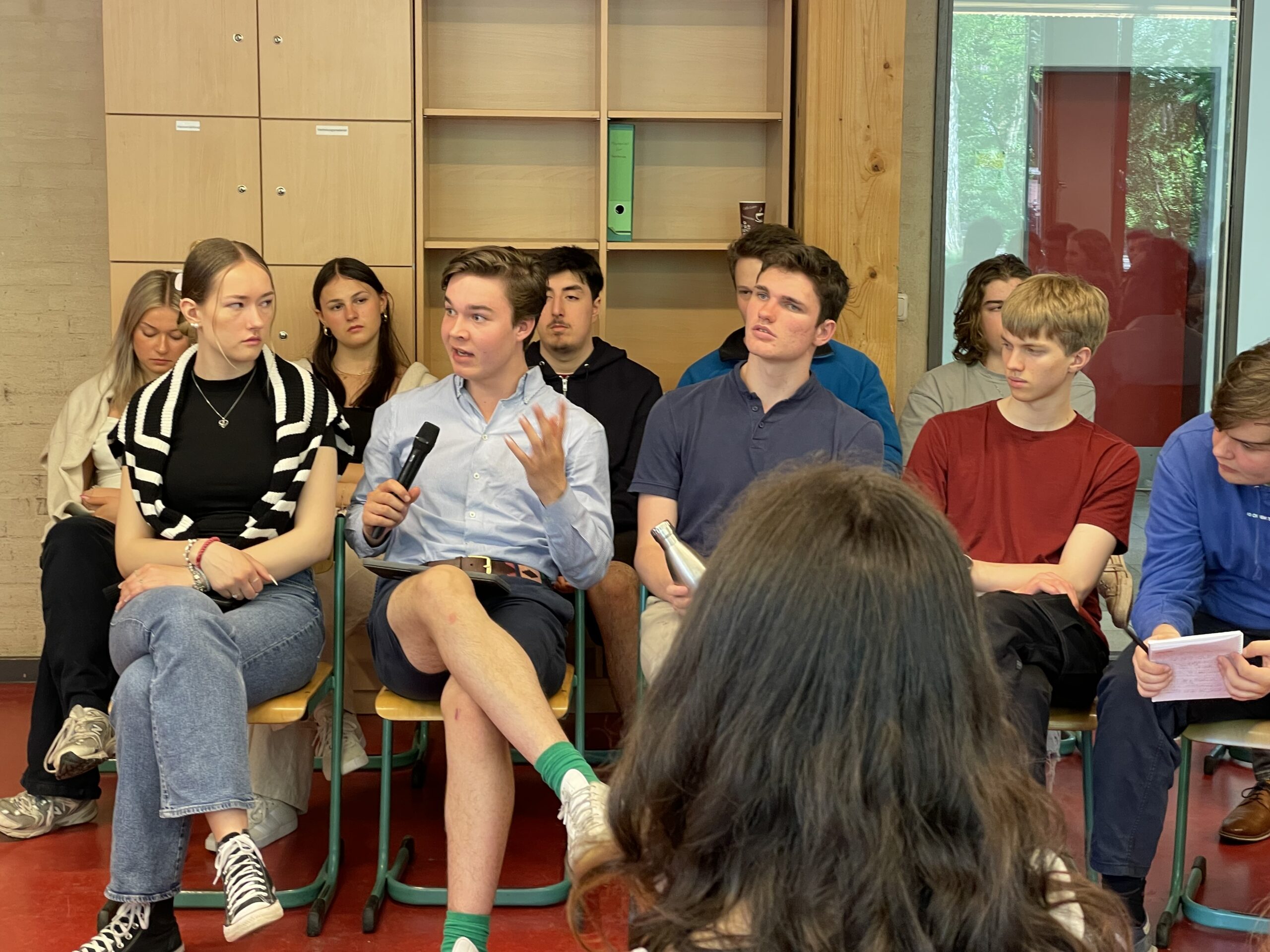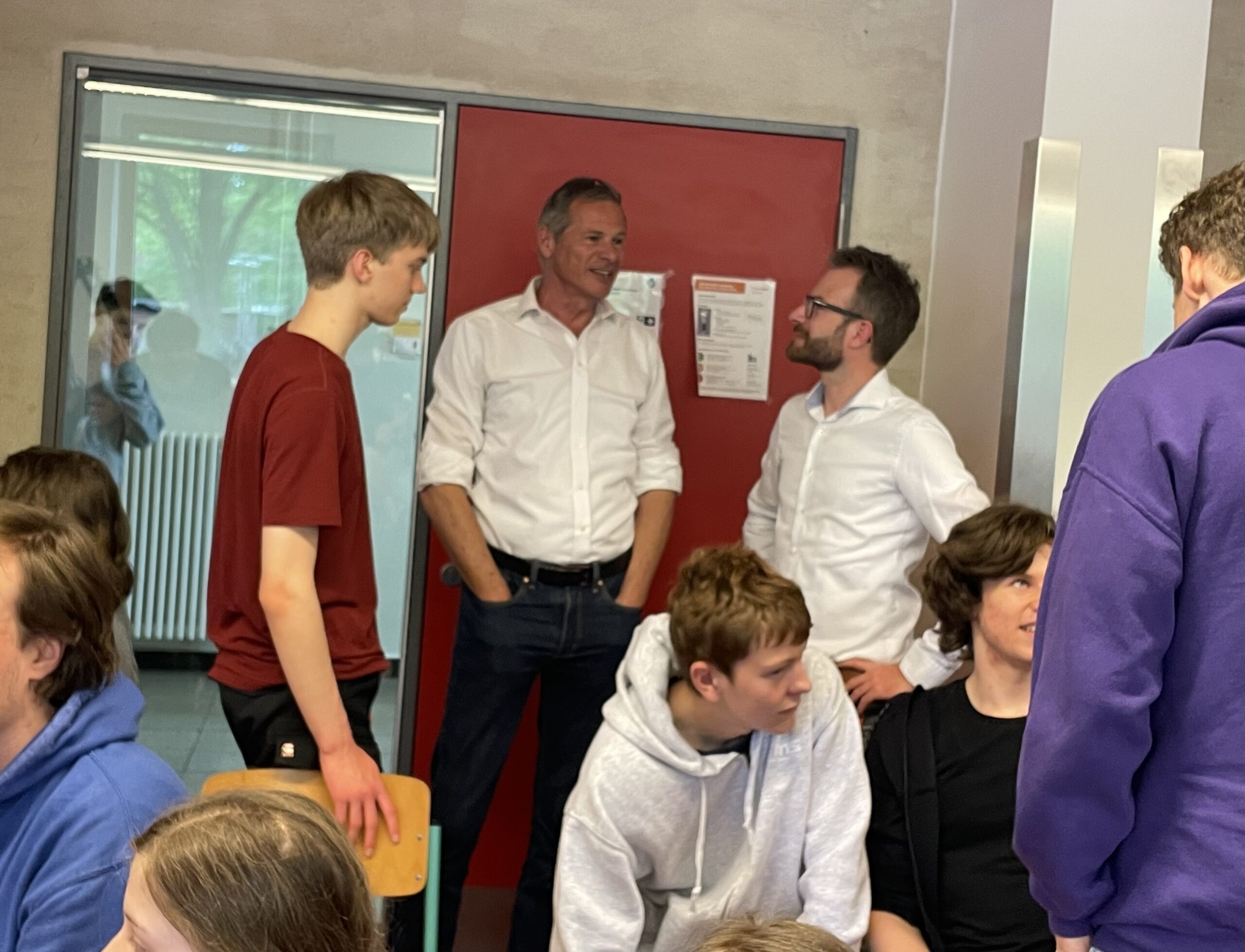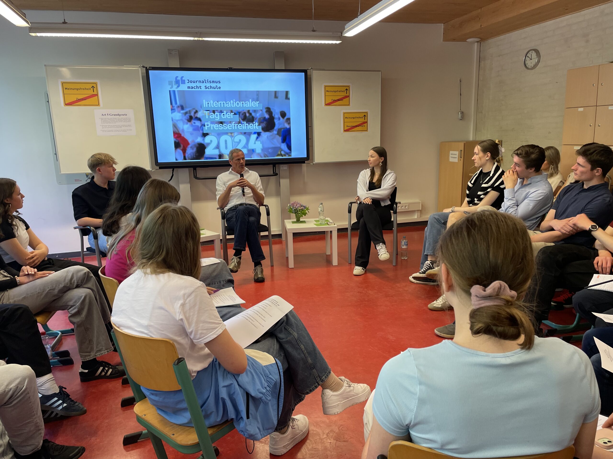 Anlass war der Tag der Pressefreiheit. Anderthalb Stunden diskutierte mit den Schülerinnen und Schülern der Klassen Q1a, Q1d und der Journalismus-AG über die Gefahren für die Demokratie, die von Fake News, insbesondere in den sozialen Medien, ausgehen. Dabei erlebten die Schüler Herrn Mascolo als zugewandten und an den Fragen und Erfahrungen der Jugendlichen interessierten Gesprächspartner.