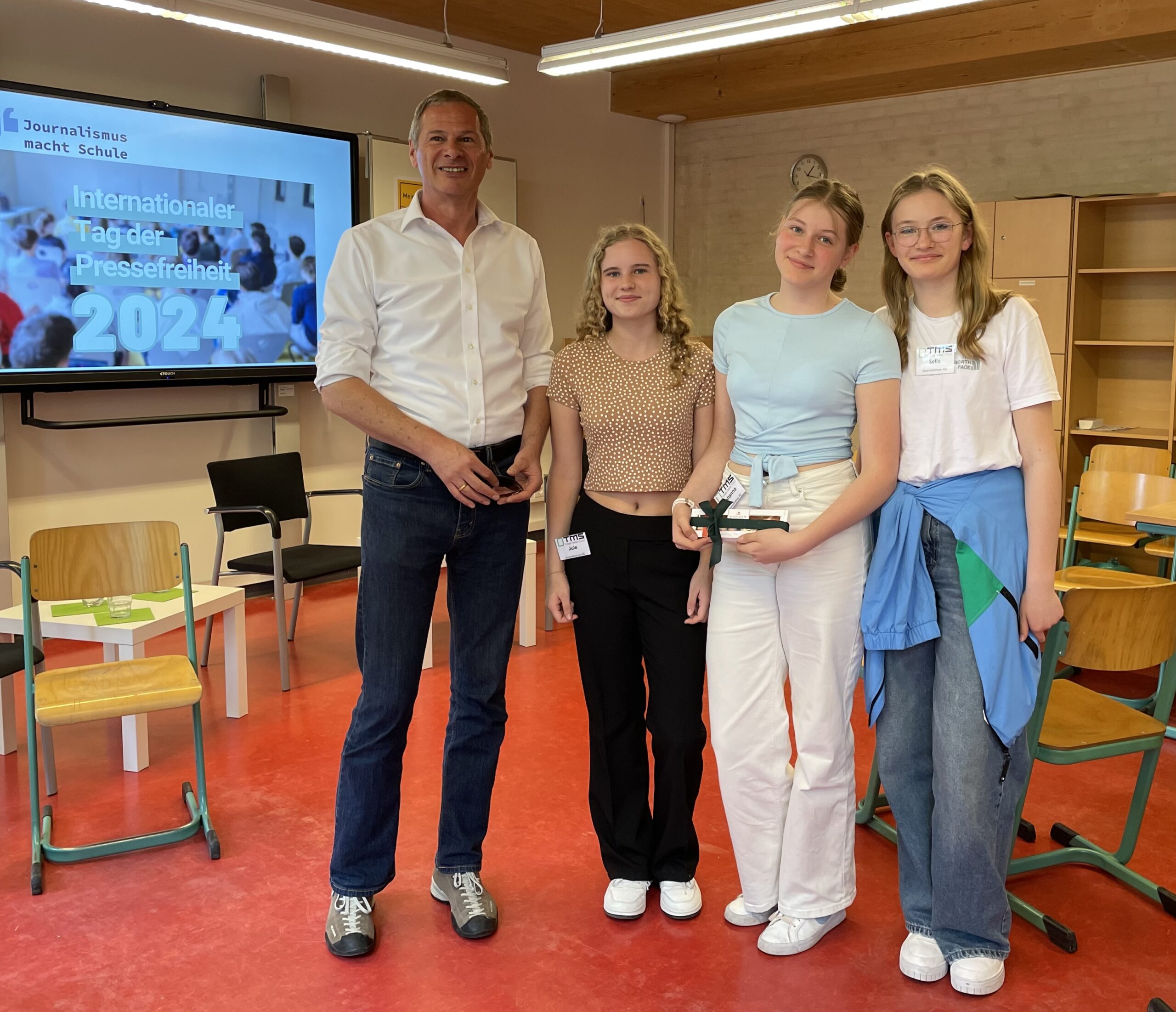 Jule, Johanna und Sofia erhielten wertvolle Tipps für ihre Arbeit in der Journalismus-AG. Ein Bericht müsse verständlich und fair sein und dürfe nicht langweilen, riet der Profi.