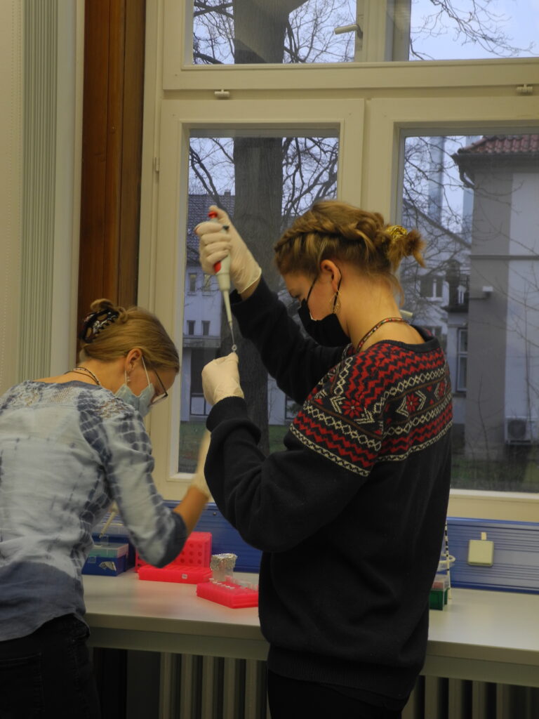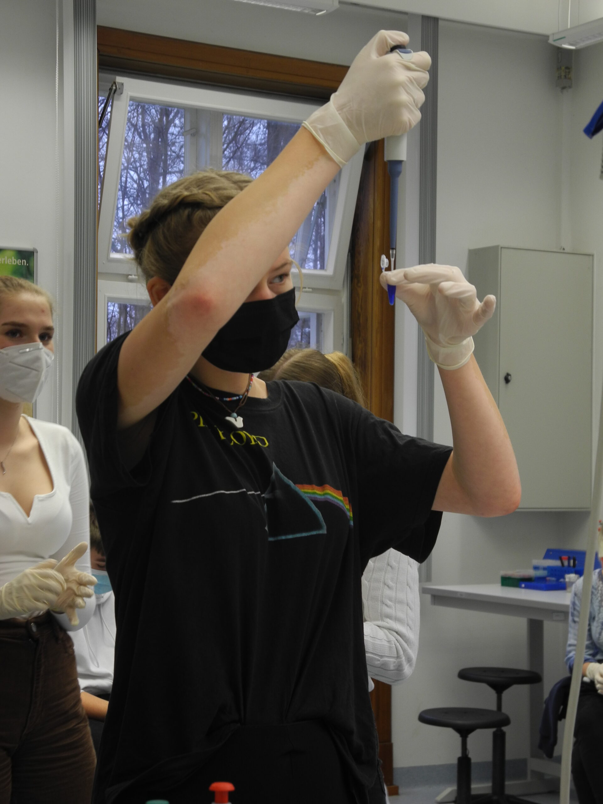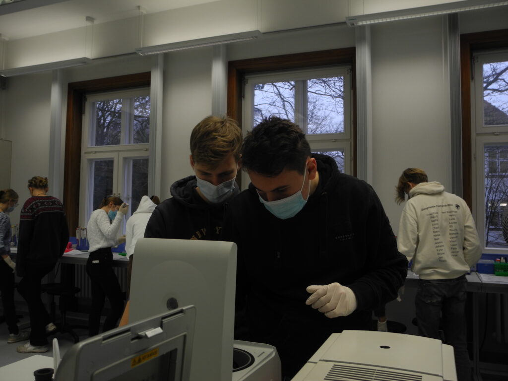 Begonnen haben wir mit der Durchführung einer PCR (Polymerase chain reaction, eine biochemische Kettenreaktion) von zwei Hausmäusen namens Agathe und Bruno. Hierbei war es erstaunlich, mit welcher Präzision man eigentlich arbeiten muss, um ein aussagekräftiges Ergebnis erzielen zu können.