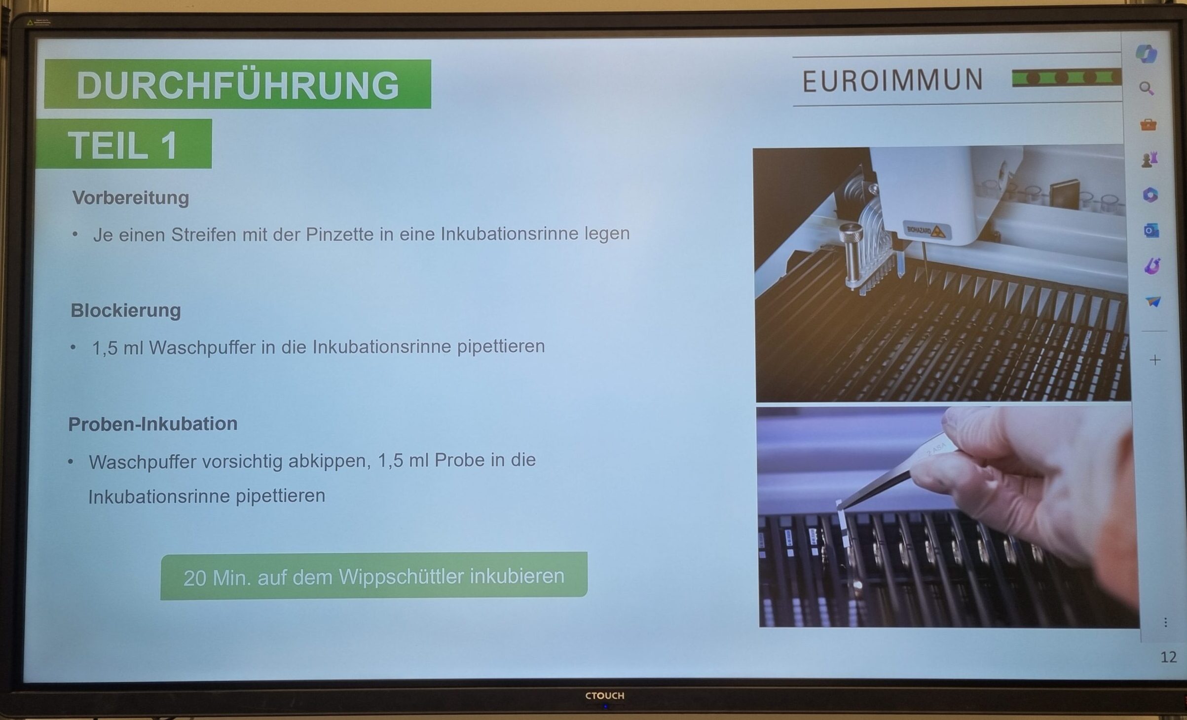 Am Dienstag, den 18.6.24 hatte die Klasse 10b Besuch von der Firma EUROIMMUN. Im Rahmen des Themas Immunbiologie hatte Frau Nitschke zwei Mitarbeiterinnen aus dem Ausbildungsteam, Kerstin Lembicz und Raphaela Böttcher, in die TMS eingeladen, die uns in einer Doppelstunde näher an die Methoden und Vorgehensweisen von EUROIMMUN heranführten.