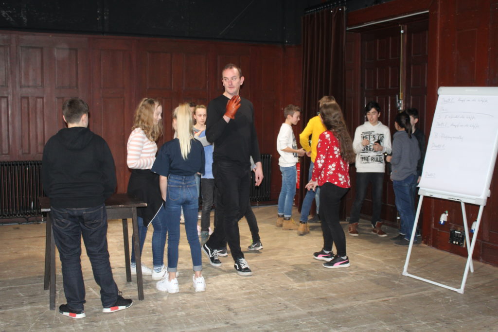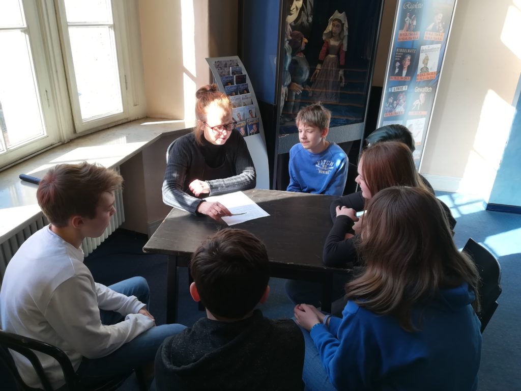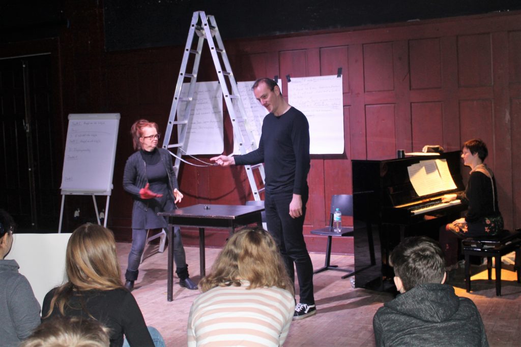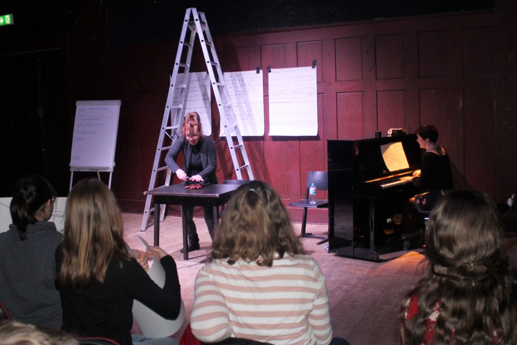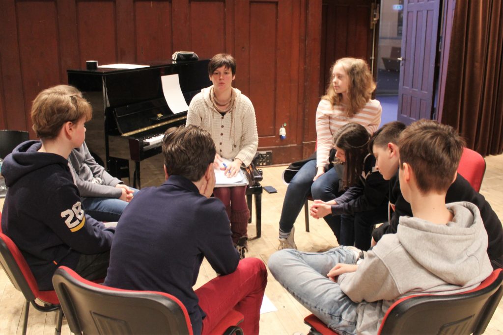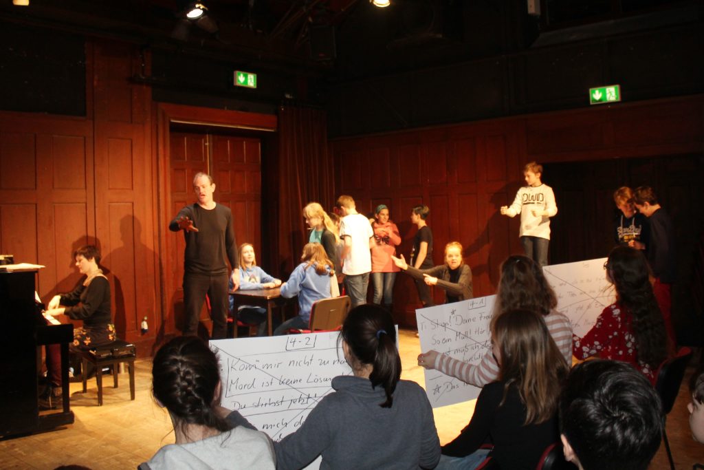 Nachdem nun die Geschichte unserer Oper feststand, teilten wir uns in vier Gruppen und schrieben, angeleitet von den Sängern, der Pianistin und dem Regisseur die Libretti, also die Texte zu den Musikstücken, auf unsere Handlung bezogen um.