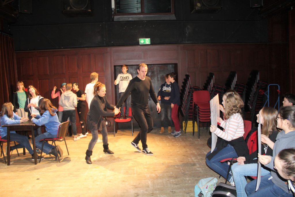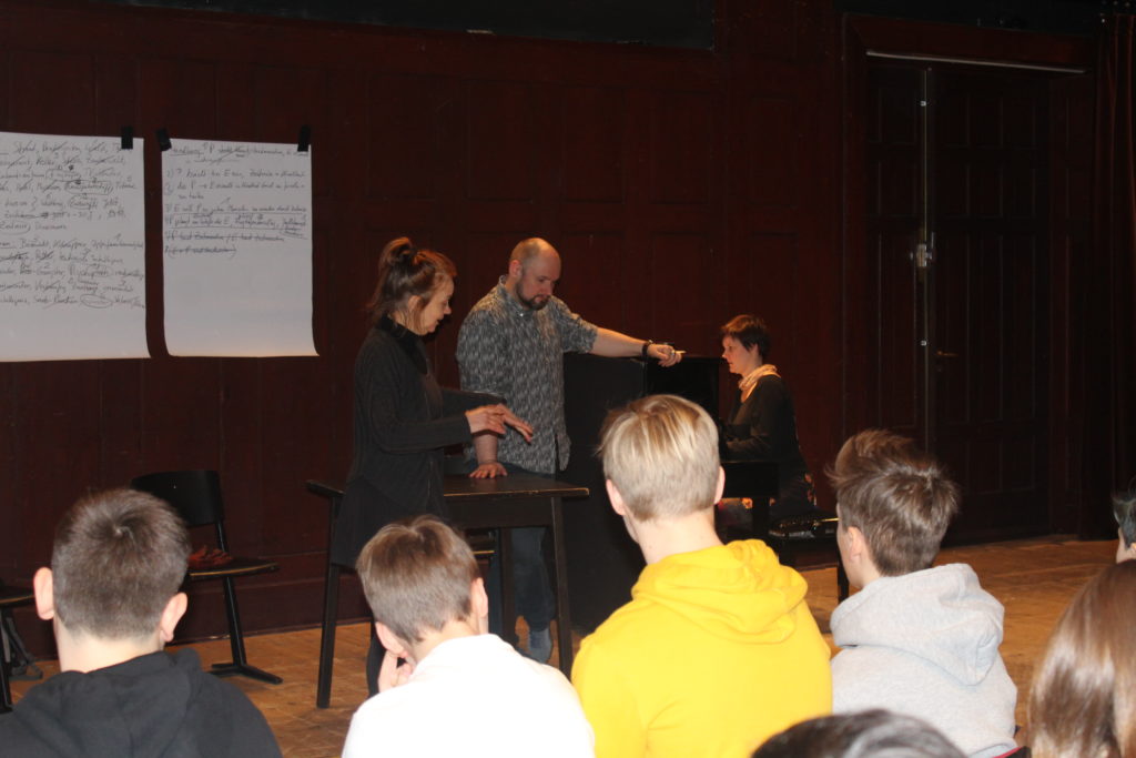 Im Stadttheater angekommen, hörten wir zu Anfang vier verschiedene Musikstücke aus der Oper „Die schöne Galathée“ von Franz von Suppé. Vorgetragen wurden sie von Bass Tobias Hagge und der Sopranistin Margit Dürr. Die Pianistin Ninon Gloger begleitete sie. Zu den zwei Arien und zwei Duetten sollten wir passende Adjektive finden, die die Stimmungen der Stücke beschreiben. Die Arie des Bassisten klang eher aggressiv und stolz, während die Arie der Sopranistin uns fröhlich, aber auch nachdenklich erschien. In den Duetten wechselten sich die Stimmen zum Teil ab, mal erklangen sie gleichzeitig und wirkten provozierend.