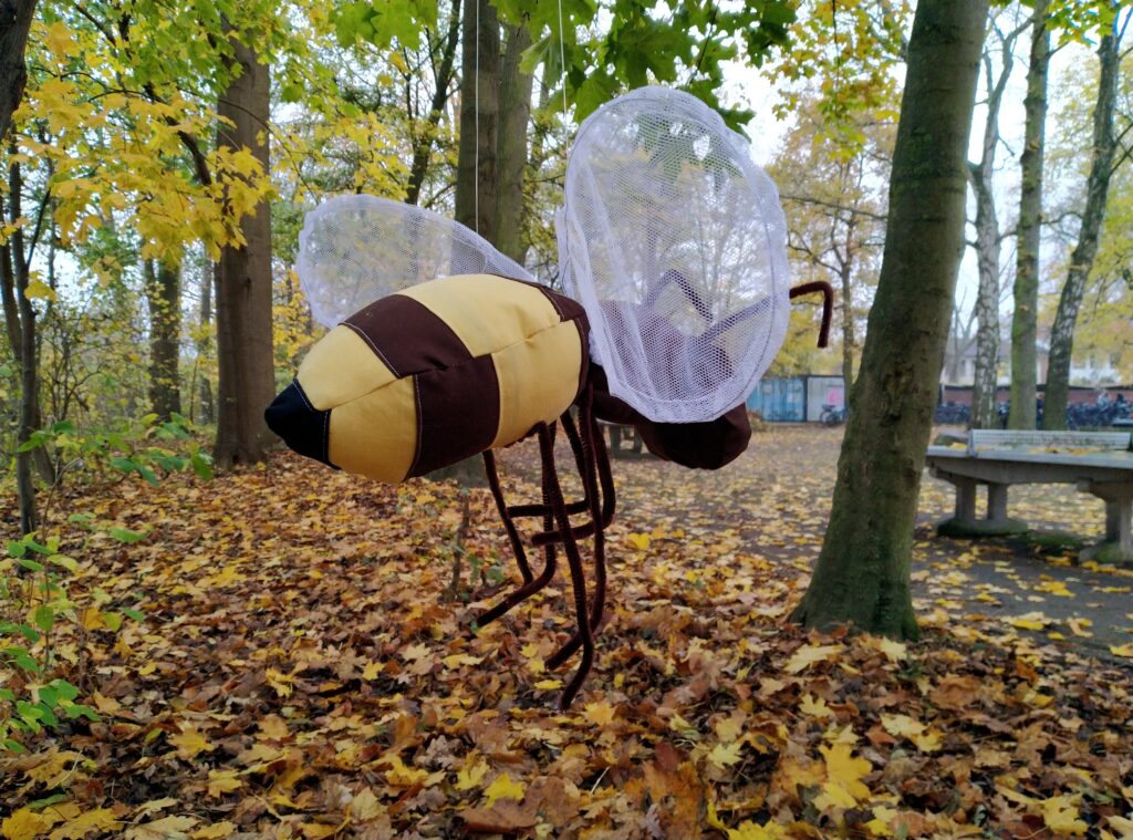 Sie schwirren und brummen, krabbeln und kratzen im Schulwald, die Insekten, die die 6. Klasse bei Kunstlehrer Ingo Bruweleit gestaltet hat. Bevor der Frost sie erstarren lässt, sind sie umgezogen ins Foyer der Schule, wo sie vergnügt umeinander fliegen.