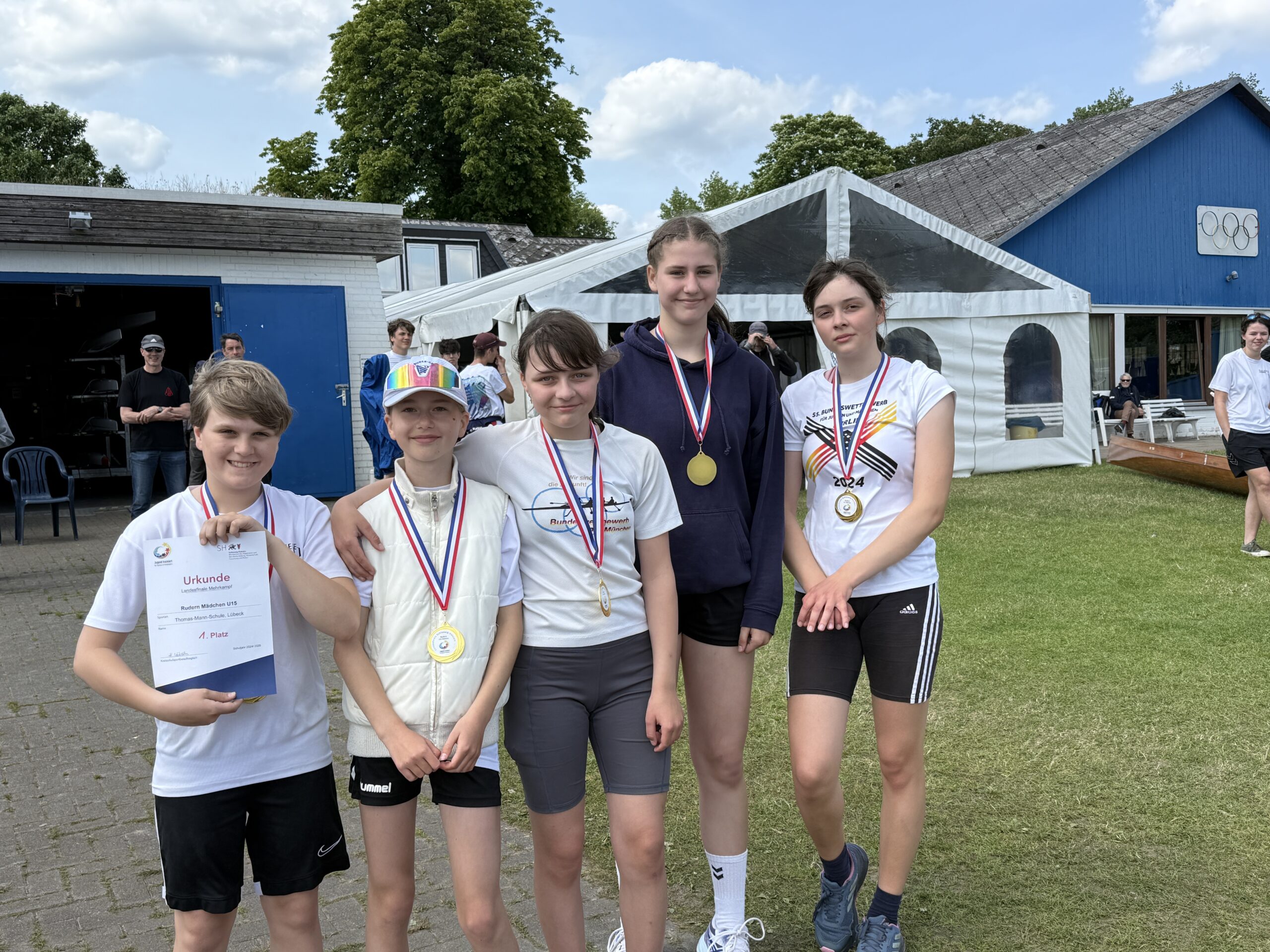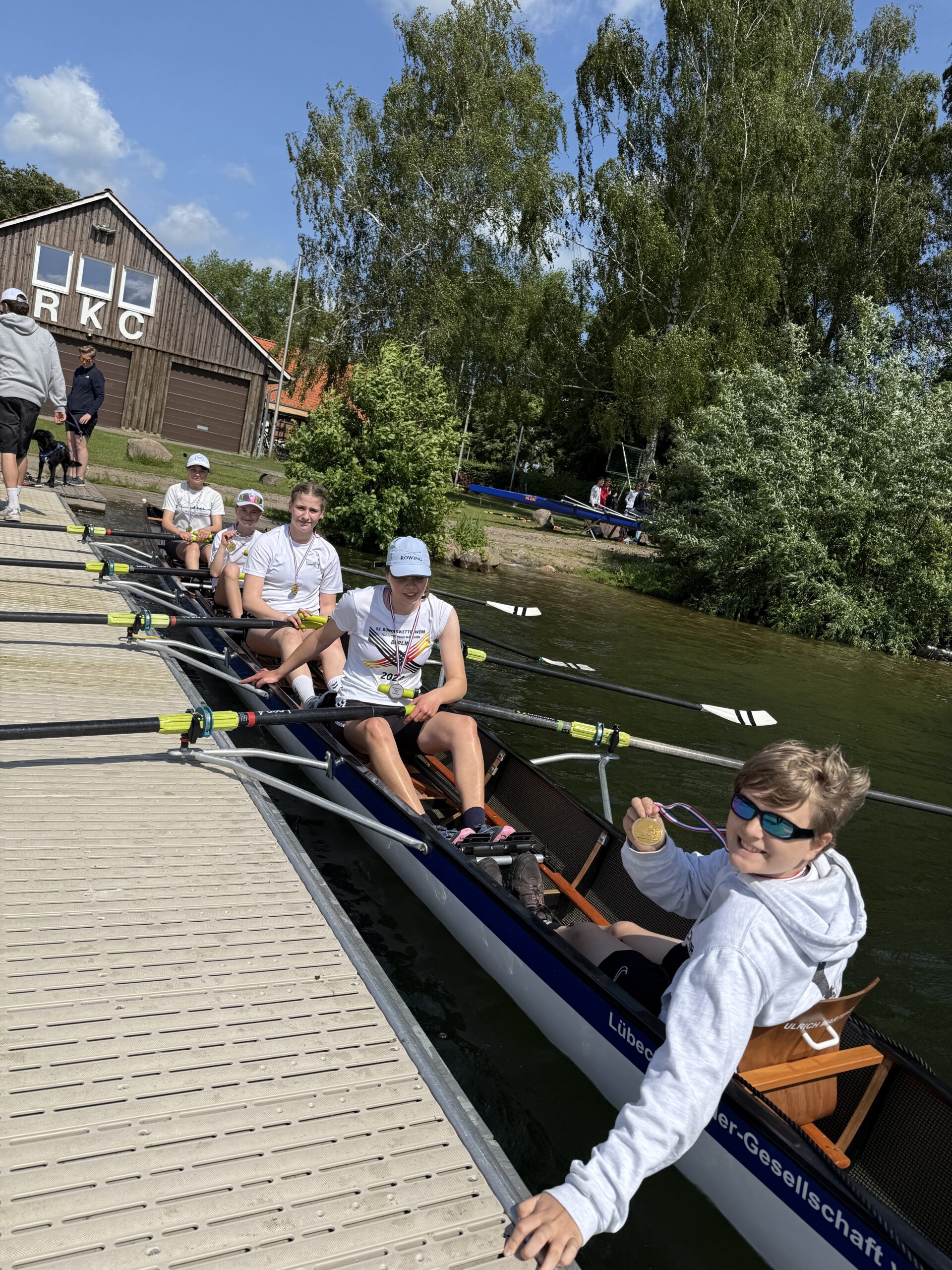 Am 03.06.2025 starteten 17 Ruderinnen und Ruderer mit dem Bus Richtung Ratzeburg, um am Landesfinale Jugend trainiert für Olympia – Rudern bzw. der Schülerregatta teilzunehmen. Mit Sonnenschein und etwas Schiebewind gingen die ersten beiden Boote um 11.15 Uhr auf die Strecke. Der Gig-Vierer U15 mit Anna, Smilla, Arina, Charlotte und Stm. Ben konnte sein Rennen souverän für sich entscheiden. Aber auch das zweite Boot mit Ida, Louisa, Nike, Lotta und Stm. Rafael, welches im Rahmen der Schülerregatta auf die Strecke gegangen war, fuhr mit einer tollen Zeit über die Strecke und überholte sogar noch das im Landesfinale gestartete Boot aus Schleswig.