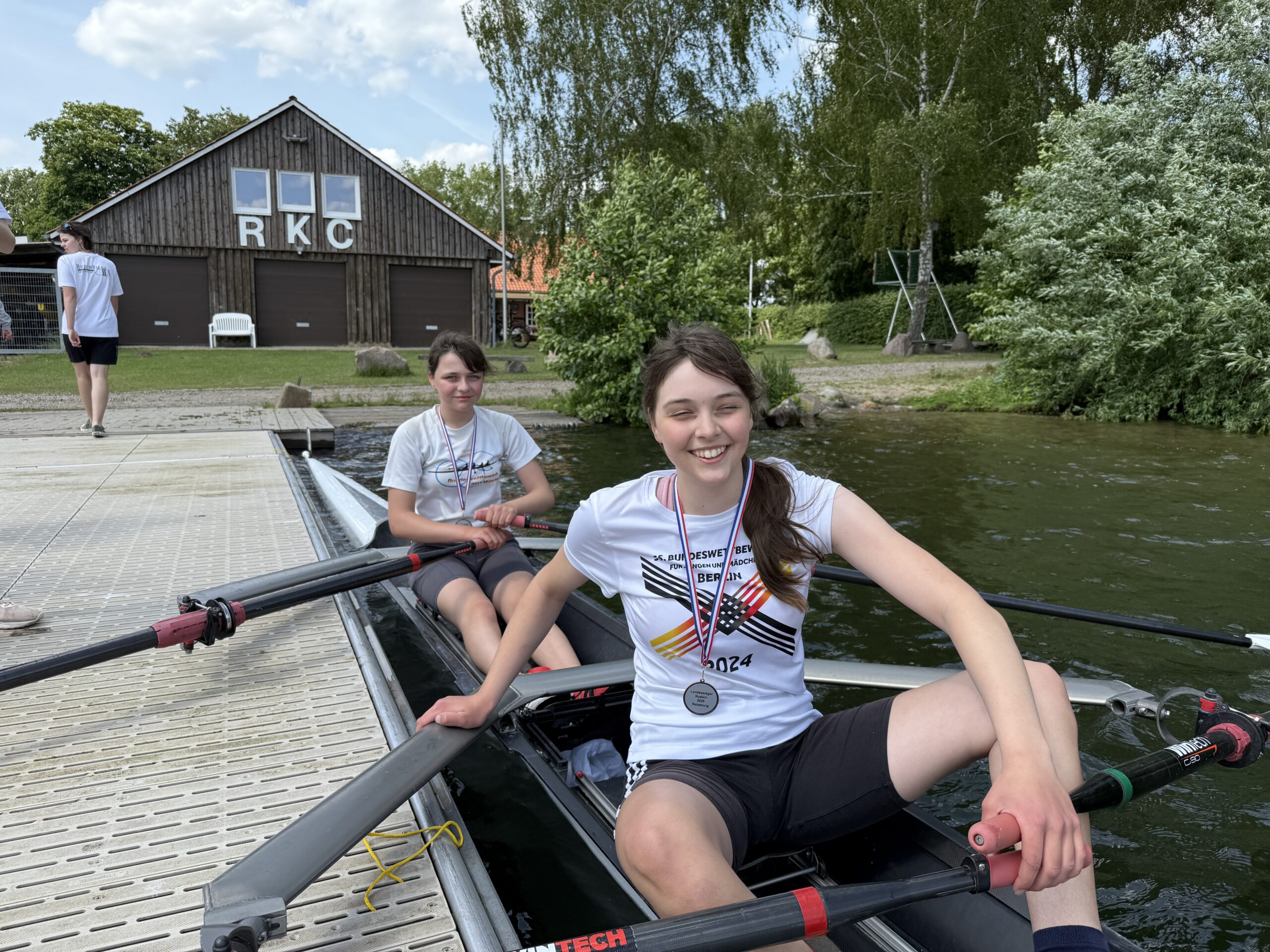 Am Ende des Tages wurde es noch einmal spannend, denn Anna und Arina starteten im Doppelzweier. Dieses Rennen war ein weiteres Qualifikationsrennen für das Bundesfinale. Obgleich die Gegner vorab als stark eingeschätzt wurden, konnten sich Anna und Arina in einem überzeugenden Rennen durchsetzen und so das Finalticket für die Mannschaft nach Berlin lösen. Herzlichen Glückwunsch an die gesamte Mannschaft für diese hervorragende Leistung. Ein Dank geht auch an die LRG, die uns hierbei mit Booten unterstützt hat.