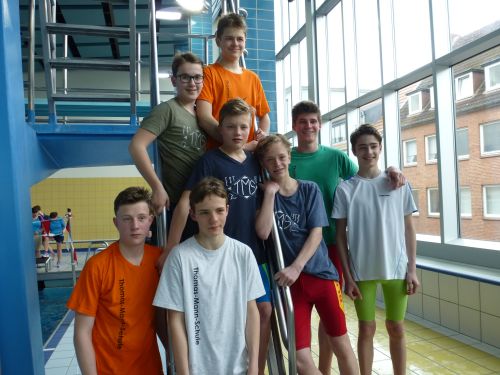 Voller Siegeswillen gingen die Schwimmer WK III aus den Klassenstufen Sechs bis Neun an den Start, die in diesem Jahr unbedingt noch einmal das Landesfinale gewinnen möchten, um nach 2013 und 2014 die Thomas-Mann-Schule wieder in Berlin beim Bundesfinale vertreten zu können. Dass die Mannschaft das schaffen kann, bewiesen die Schwimmer, indem sie fast jeden Lauf gewannen, teilweise sogar sehr deutlich, sodass sie sich wie die kleinen Mädchen den 1. Platz der Kreismeisterschaften sicherten.