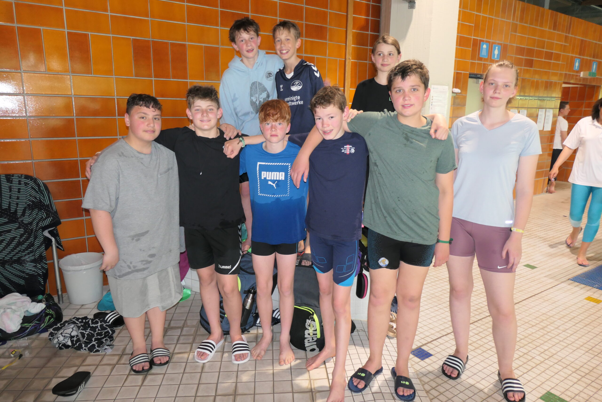 Für die Jungen waren Eren, Mika, Theo, David, Maximilian, Philipp, Rojus und Bruno (alle Klassenstufe 6) dabei. In vier Staffeln und einem zehnminütigen Dauerschwimmen mussten die Mannschaften der Wettkampfklasse IV gegeneinander antreten. Sie schwammen Kraul, Rücken und Brust, es gab eine Beinschlagstaffel mit Schwimmbrett sowie eine Staffel, in der bestimmte Koordinationen von Schwimmstilen geschwommen werden musste. Dies hatten wir vorher im Training geübt, trotzdem ist es schwierig, da so etwas sonst nicht im Schwimmunterricht in der Schule oder im Training im Schwimmverein geübt wird. Beide Mannschaften strengten sich sehr an und waren hochmotiviert dabei. Bei den Mädchen, die sicherlich die jüngste Mannschaft vor Ort war, kam es am Ende zu einem fünften Platz. Die Jungen durften sich über den ersten Platz freuen und fahren nun am 30. Juni zum Landesfinale nach Kiel.