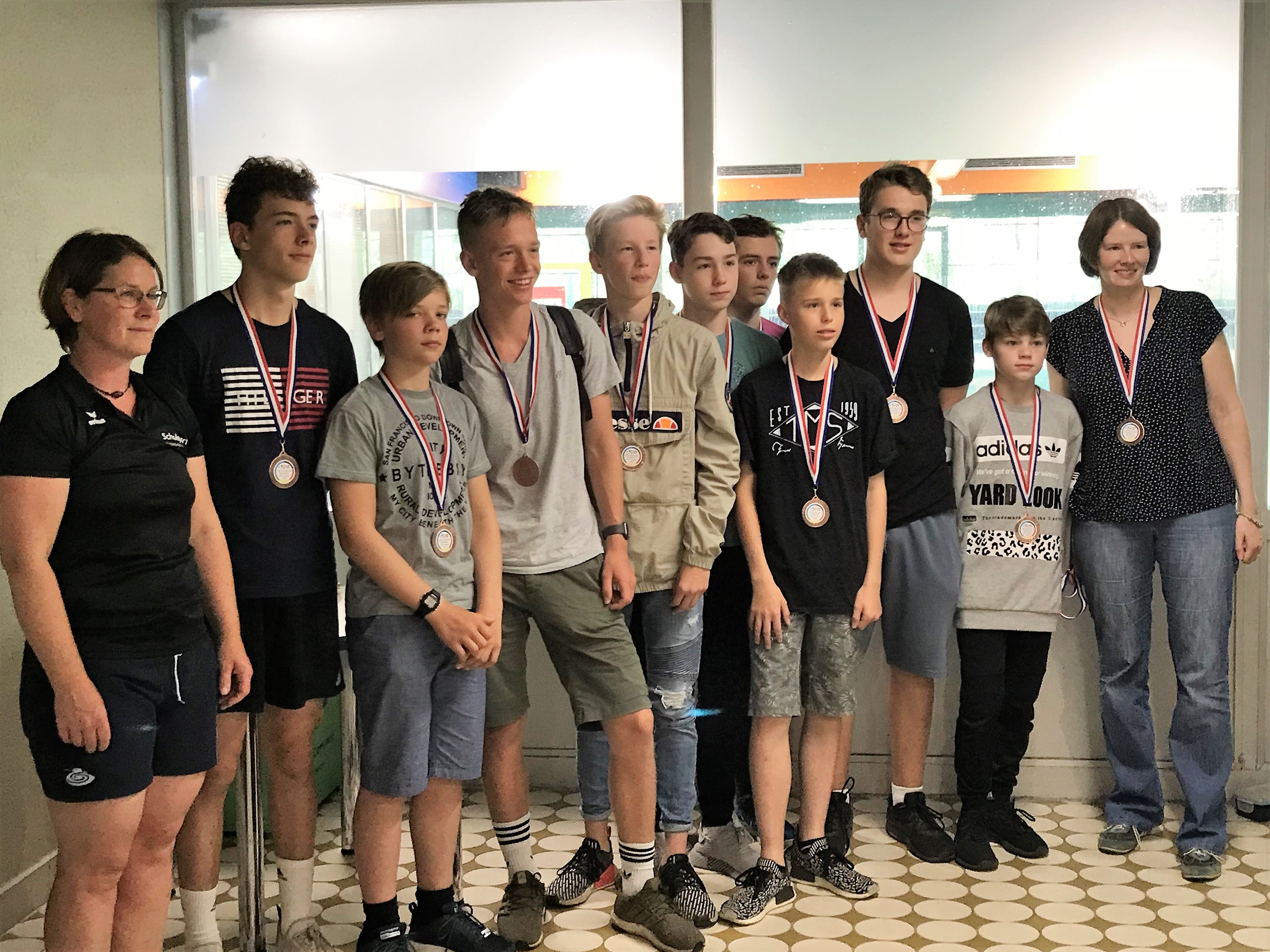 Nachdem bei den Jungen WK III der beste Schwimmer am Vorabend abgesagt hatte, war die Mannschaft am Morgen vor der Halle erst einmal ratlos, wer unter anderem die 50m Delphin in der Lagenstaffel übernehmen sollte, da sonst keine Leistungsschwimmer im Team sind. Aber Jasper ließ sich von den anderen überreden und testete beim Einschwimmen, wie gut er diese Lage beherrschte. Auch die anderen probierten sie noch einmal aus, und es stellte sich heraus, dass Maximilian noch etwas besser geeignet war, sodass erneut die Staffelaufstellung umgestellt wurde. Vielen Dank, Maximilian, dass du das übernommen hast, sonst hättet ihr nicht starten können! Und wie gut es war, dass das Team an den Start ging, zeigte sich am Ende mit dem Gewinn der Bronzemedaille – eine absolut hervorragende Leistung für Paul, Raul, Tom, Magnus, Jasper, Maximilian, Arne, Marco und Nico (Klassenstufe 7 bis 9)! Ihr könnt wirklich stolz auf euch sein!