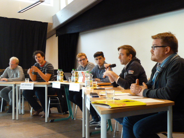 Einig waren sich die Diskutierenden aber in dem Anliegen, die ca. 150 versammelten Erstwähler zum Urnengang am 7.5. zu motivieren. In Anlehnung an Max Frischs Zitat „Demokratie ist, sich in die eigenen Angelegenheiten einzumischen“ appellierten sie an das Publikum, nicht den Wählern extremer Parteien das Feld zu überlassen, sondern von ihrem Wahlrecht Gebrauch zu machen.