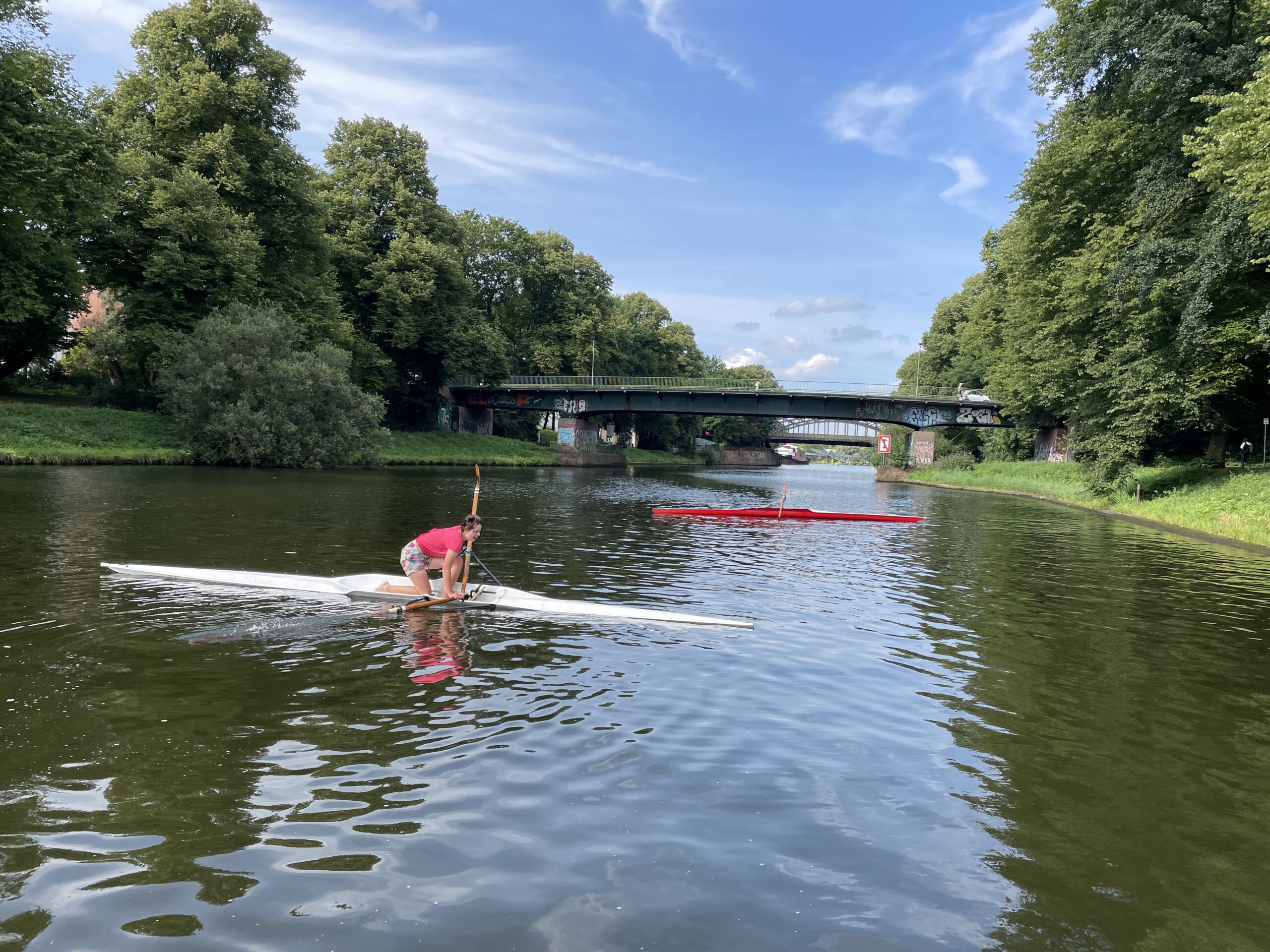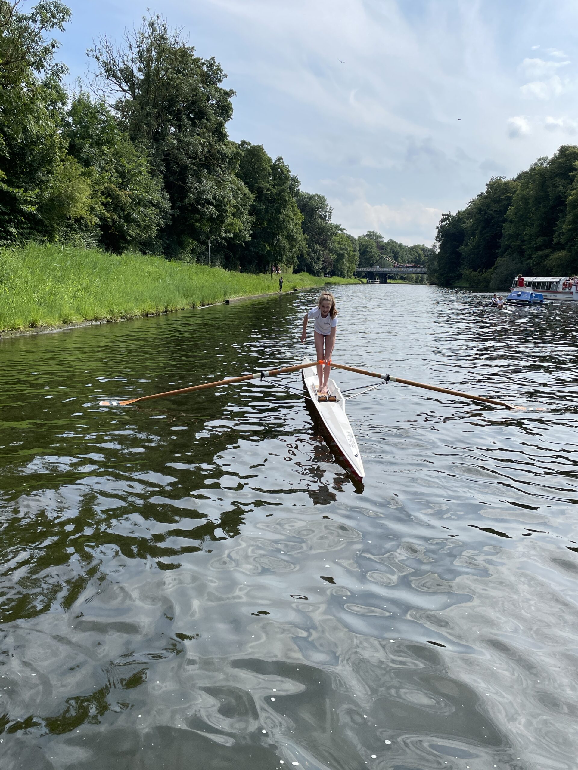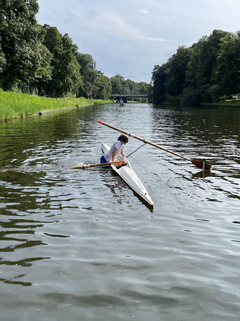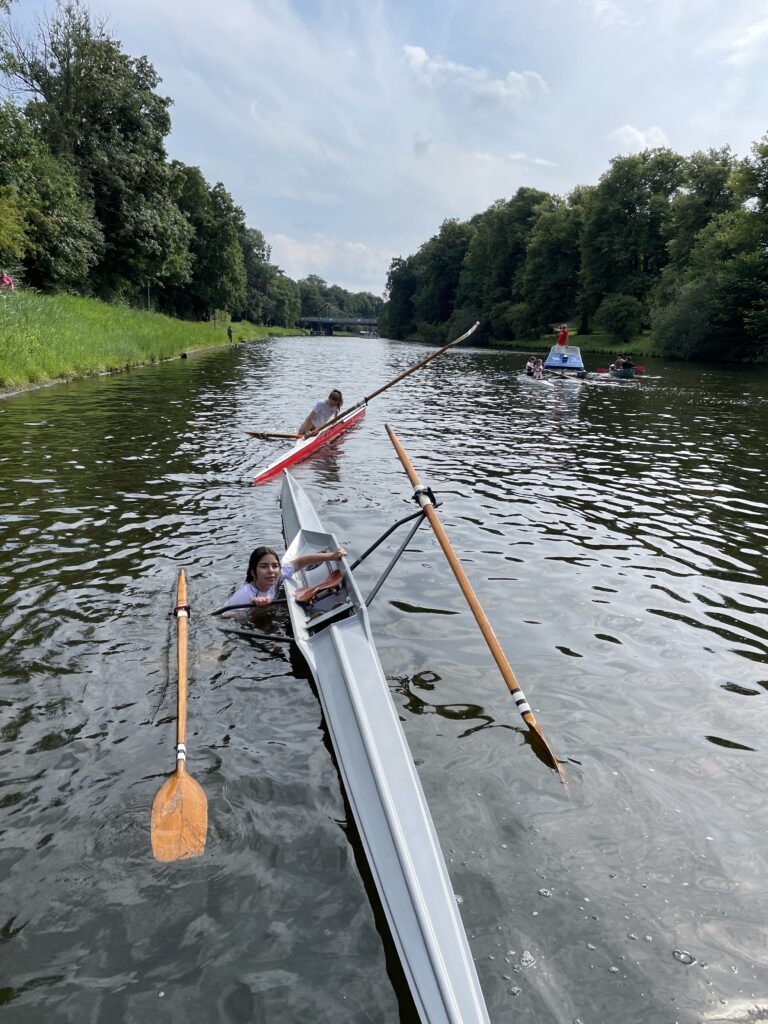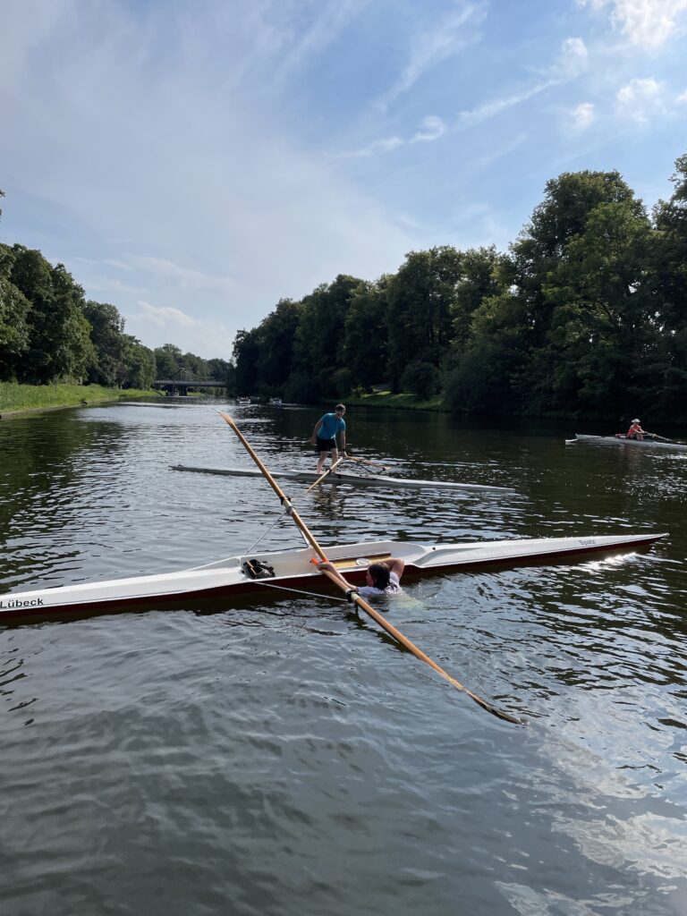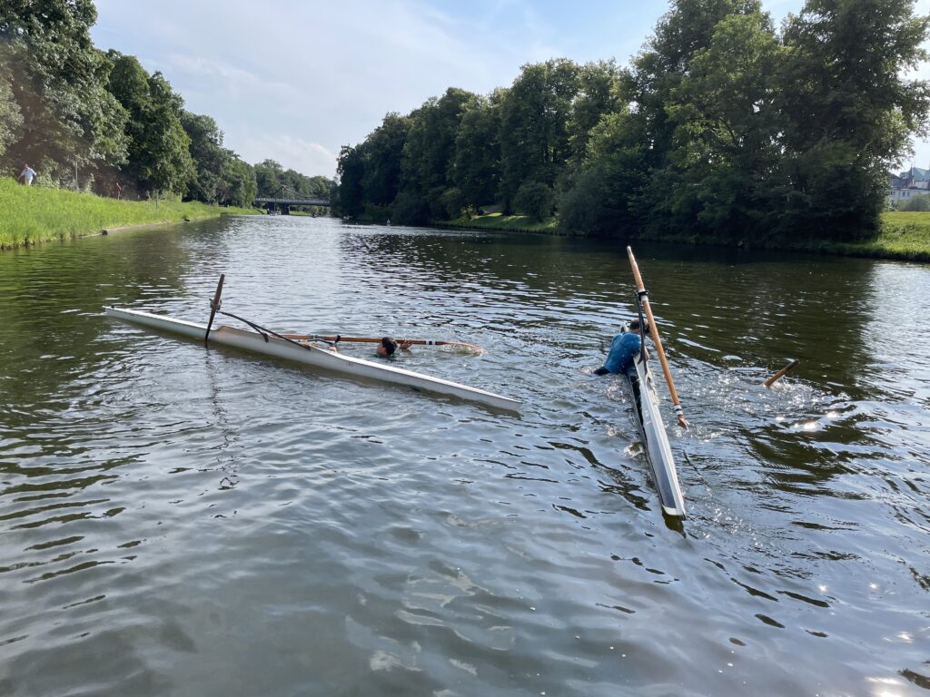 Nach dem Landesentscheid JtfO und der internen Regatta gab es für die Ruder-Riegen-Mitglieder einen weiteren Höhepunkt ganz anderer Art: RuSchwi (Rudern und Schwimmen). Während normalerweise das Kentern im Einer als peinlich empfunden wird und die häufigste Ausrede im normalen Ausbildungsbetrieb lautet: „Ich kann heute nicht im Skiff rudern, ich habe keine Wechselsachen mit!“, erfreut sich die Veranstaltung „RuSchwi“ großer Beliebtheit. Bei 30°C Lufttemperatur werden die ältesten Einer aus der Halle geholt. Überrascht stellen die Aktiven fest, dass es ja gar nicht so leicht ist, mit dem Boot zu kentern. Einige Ruderer stehen sogar in dem 7 m langen und 35 cm breiten Skiff auf,ohne baden zu gehen. Ist es dann gelungen, ins Wasser zu fallen, kommt die Hauptaufgabe: Wie steige ich aus der Schwimmlage wieder ein? Schon das Drehen des Bootes ist eine Herausforderung. Ist das gelungen, müssen die Skulls im 90° Winkel zum Boot liegen. Dann schiebt man sich mit dem Oberkörper auf das Boot, kommt in Sitzposition und holt die Beine nach, geschafft!
