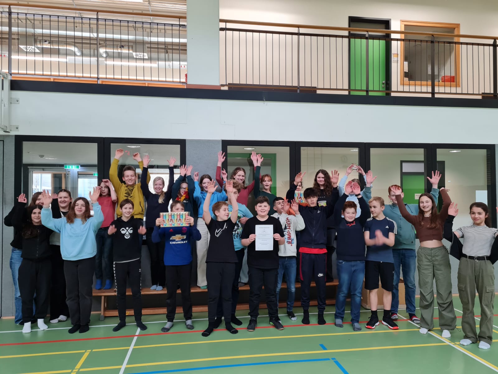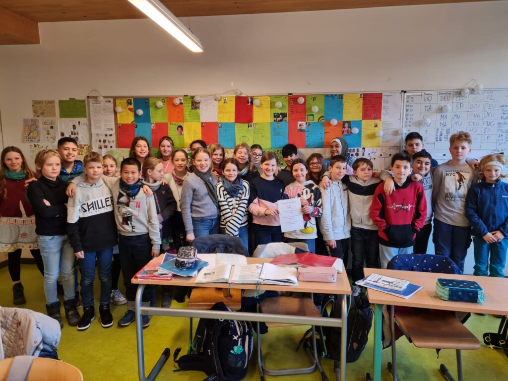 Die 7c hat den zweiten Platz belegt, einen Gutschein für eine Pflanze, Süßigkeiten und eine Spielstunde gewonnen, in der wir zusammen Fußball und Völkerball gespielt haben.