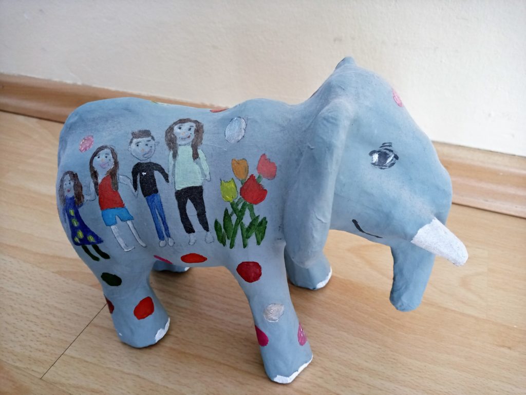 Anna schreibt: „Ich habe einen Elefanten bemalt zum Muttertag. Einen Elefanten deshalb, weil ich meine Mutter so stark wie einen Elefanten finde und dass sie uns vier Kinder beschützt. Darum habe ich vier Kinder auf den Elefantenrücken gemalt. Dazu Blumen, weil Mama Blumen mag und wir alle gerne in unserem Schrebergarten sind.“