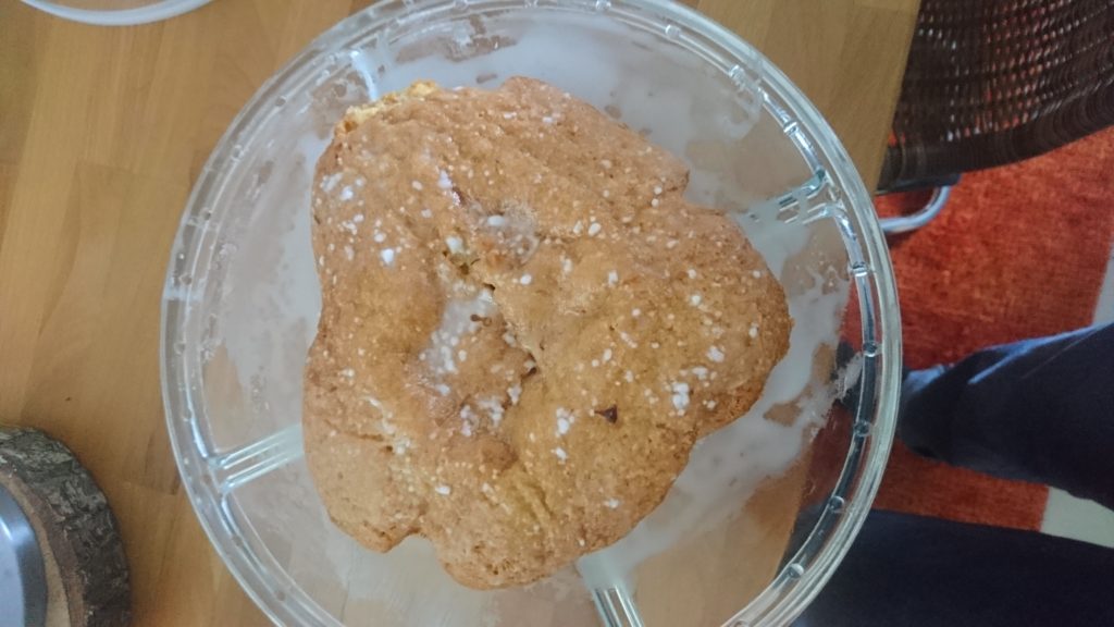 Bens Hefebrot ist mit Zuckerguss bestrichen und Hagelzucker bestreut.