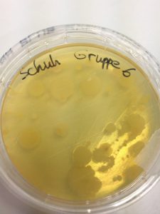 Außerdem haben wir verschiedenste Methoden zur Analyse und Bestimmung von Bakterien und anderen Mikroorganismen kennengelernt, z.B. den sogenannten Abklatschtest, mit dessen Hilfe man die Verunreinigung von Gegenständen mit Keimen nachweisen kann. Dazu werden sterile Nährböden an den Gegenstand gedrückt, sodass die dort befindlichen Mikroorganismen übertragen werden. Nach dem Wachstum der Keime im Brutschrank kann die biologische Verunreinigung durch das Bestimmen und Auszählen der Bakterien ermittelt werden.