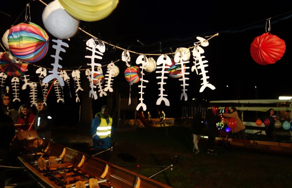 Der Jungen-Zweier hatte das Thema „Geisterstunde“ gewählt. Vorn prangte auf einer Holzschreibe ein großer beleuchteter Kürbis und an den Drähten hingen neben den Lampions Fischgräten zum Gruseln.