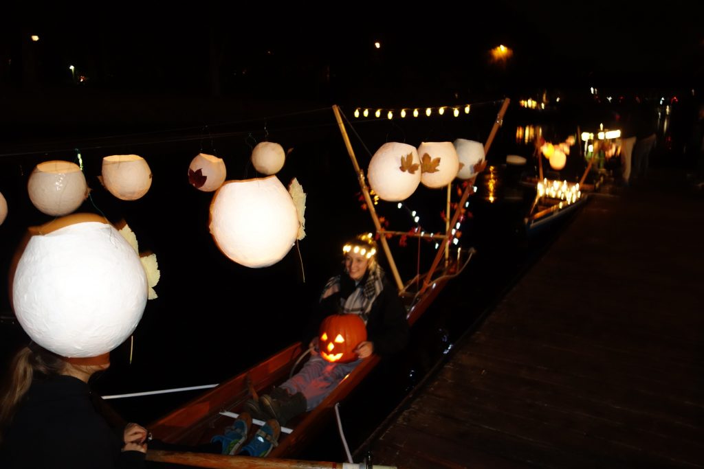 Die Vierer-Mannschaft hatte das Motto „Herbst“ gewählt und weiße Laternen, beklebt mit einem bunten Blatt, gebastelt. Die Steuerfrau hatte einen beleuchteten Kürbis auf dem Schoß.
