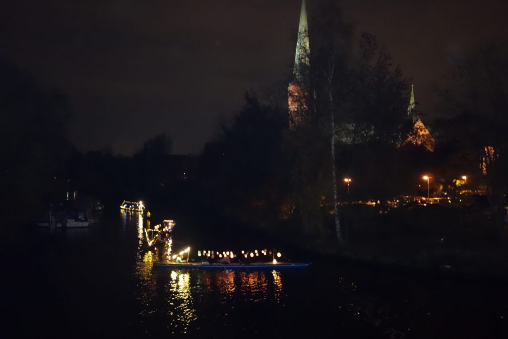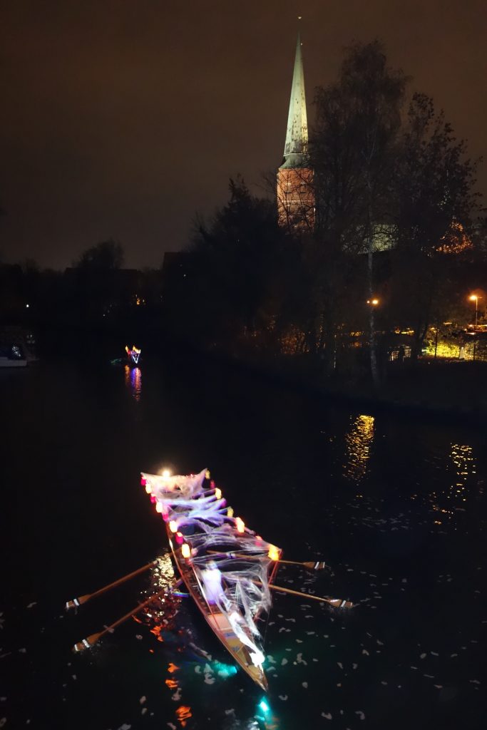 Glück gehabt! Das von den Meteorologen angekündigte Tiefdruck „Husch“ verspätete sich um einen halben Tag und bescherte den Ruderern optimale Wetterbedingungen: milde Temperaturen und Windstille, so dass sich die Laternen auf dem Wasser wunderschön spiegelten. Die Ruder-Riege der Thomas-Mann-Schule war mit dem Vierer FELIX KRULL und dem Zweier RALLE vertreten, der nach der Lackierung in den Herbstferien seine erste Ausfahrt machen konnte.