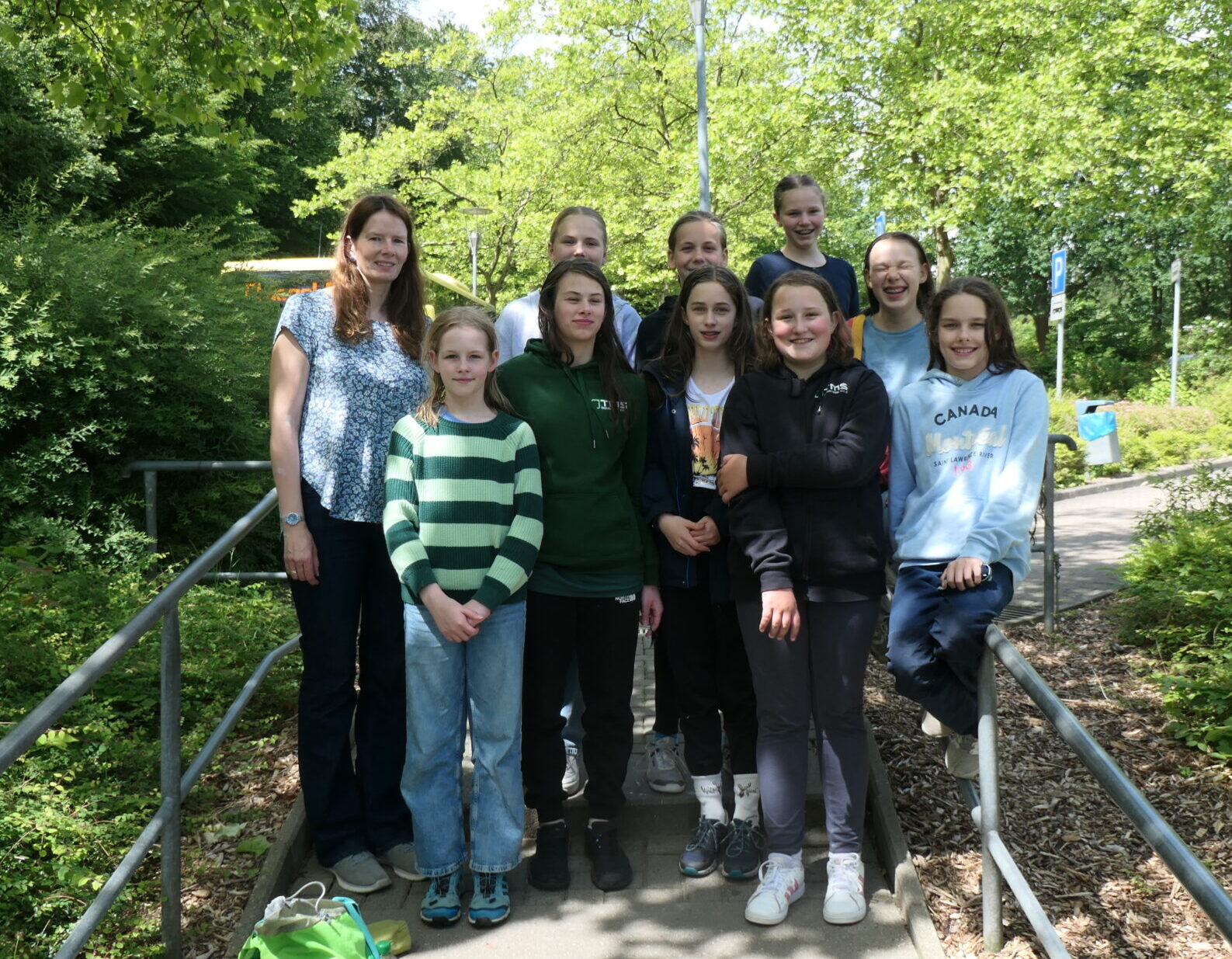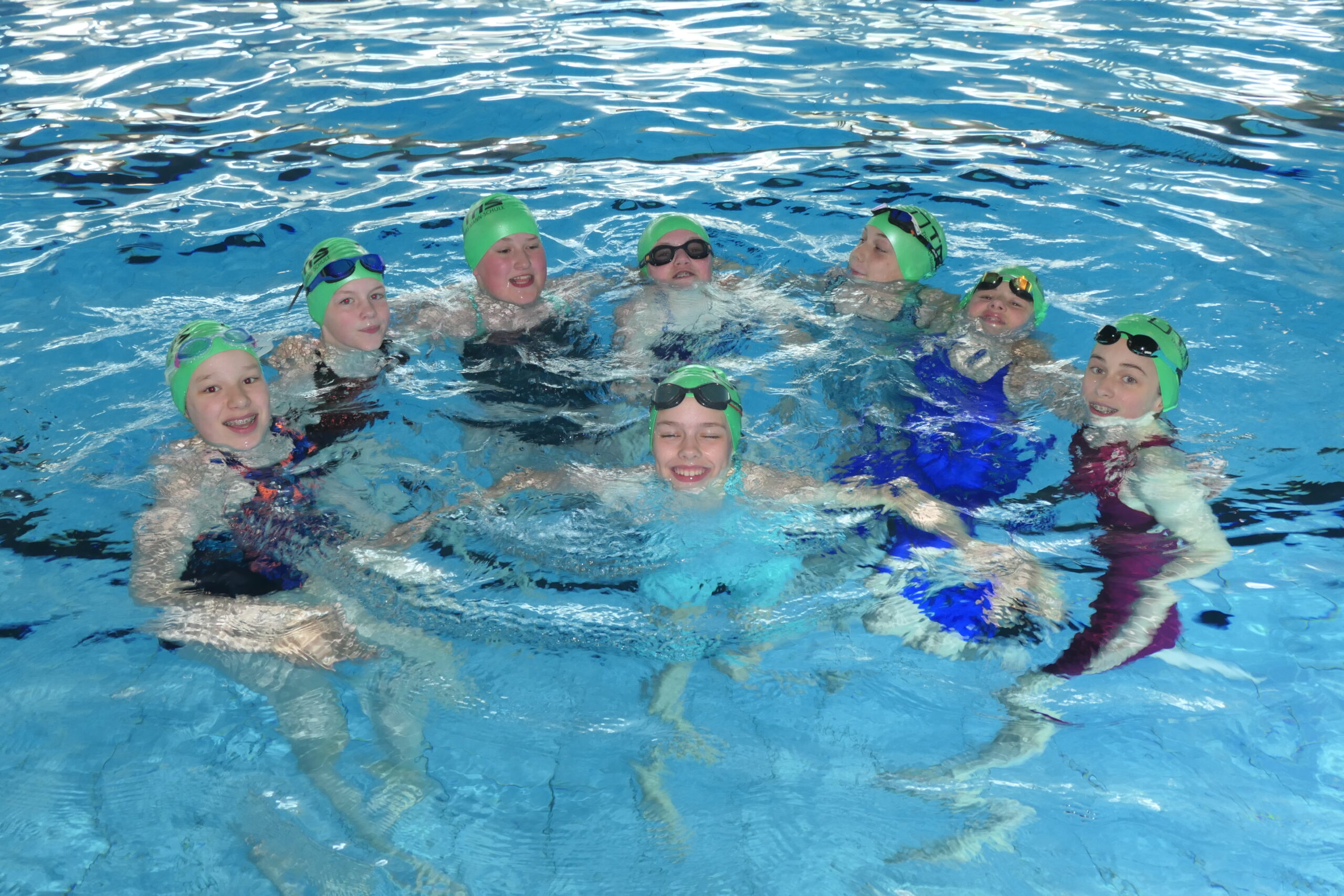 Die Mädchen, die in der Wertungsgruppe WK IV, der jüngeren Mädchen, antraten, hatten wie im Vorkampf fünf Wettkämpfe zu absolvieren. In der ersten Staffel (Kraul und Rücken im Wechsel) belegten sie den siebten Platz, sie kamen leider nicht so gut in den Wettkampf wie im Vorkampf. Etwas besser lief die Beinschlagstaffel, hier erreichten sie den fünften Platz. Im Brustschwimmen dagegen konnten sie zeigen, was sie konnten, sie schlugen als Erste an und freuten sich riesig! Die Koordinationsstaffel beendeten sie auf Platz sechs, im zehnminütigen Dauerschwimmen erreichten sie einen tollen dritten Platz, sodass am Ende ein vierter Platz dabei herauskam. Etwas enttäuscht, dass es nun doch keine Medaille geworden war, aber dennoch froh, sich von hinten wieder nach vorn gekämpft zu haben, bestiegen sie den Bus zur Abfahrt. Herzlichen Glückwunsch dafür an Anna, Nike, Pua, Lotta, Frieda, Lotta, Henriette, Lin und unsere Ersatzschwimmerin Carlotta!