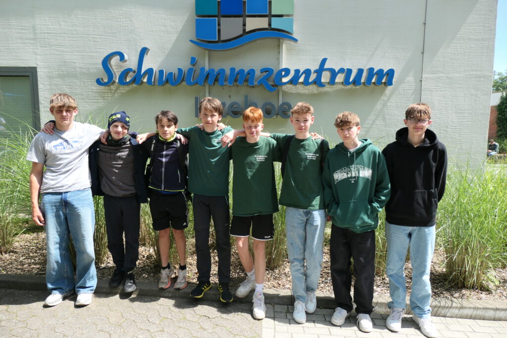 Am Donnerstag, den 20.6.2024 brachen die beiden Schwimmmannschaften der TMS schon um 7.00 Uhr morgens an der MuK auf, um mit einem Bus zum Landesfinale nach Itzehoe gefahren zu werden. Dort sollten die jeweils acht besten Mannschaften des Bundeslandes gegeneinander antreten. Die Mädchen waren etwas aufgeregt, lagen sie doch nach den Ergebnissen des Vorkampfes auf dem zweiten Platz und erhofften sich eine Medaille. Die Jungen gingen als Siebte in den Wettkampf und freuten sich, dass sie überhaupt dabei waren. Leider musste ein Schwimmer eineinhalb Tage vorher wegen einer Erkrankung absagen – und als wir in Itzehoe aus dem Bus stiegen, ging es einem weiteren Jungen nicht gut. Wir stellten alle Einsätze so um, dass dieser nur noch einen Einsatz ganz am Schluss hatte, und hofften, dass es ihm bis dahin besser gehen würde.