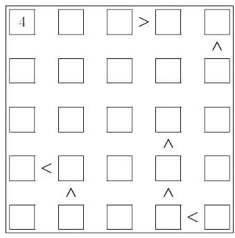 Die Ziffern 1 bis 5 sind waagerecht und senkrecht so einzutragen, dass in Zeilen und Spalten keine Dopplungen auftreten. Außerdem müssen die Relationszeichen beachtet werden. Schlussendlich war die Summe der Diagonale von oben links nach unten rechts gesucht. Probiert es aus – das macht Spaß!