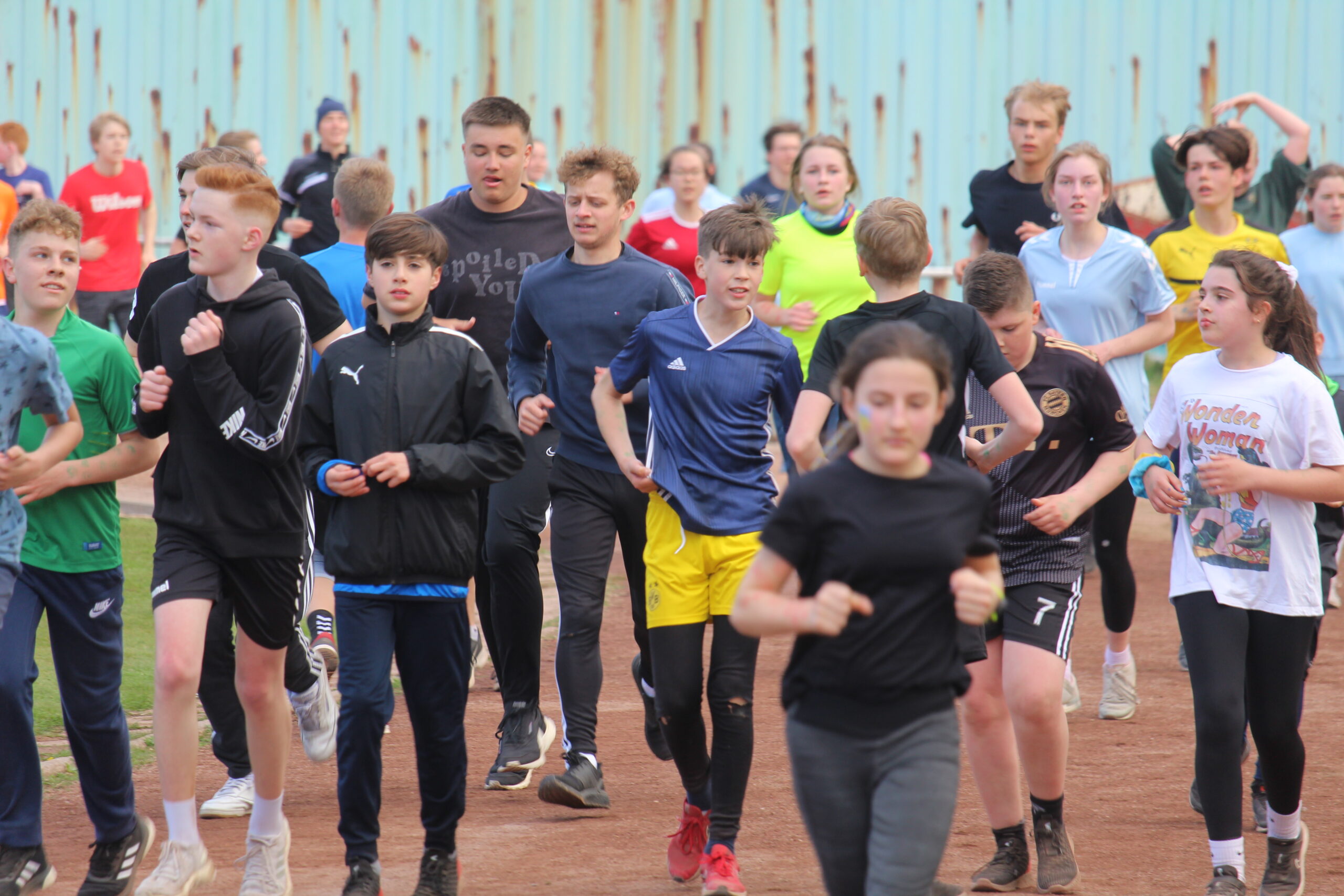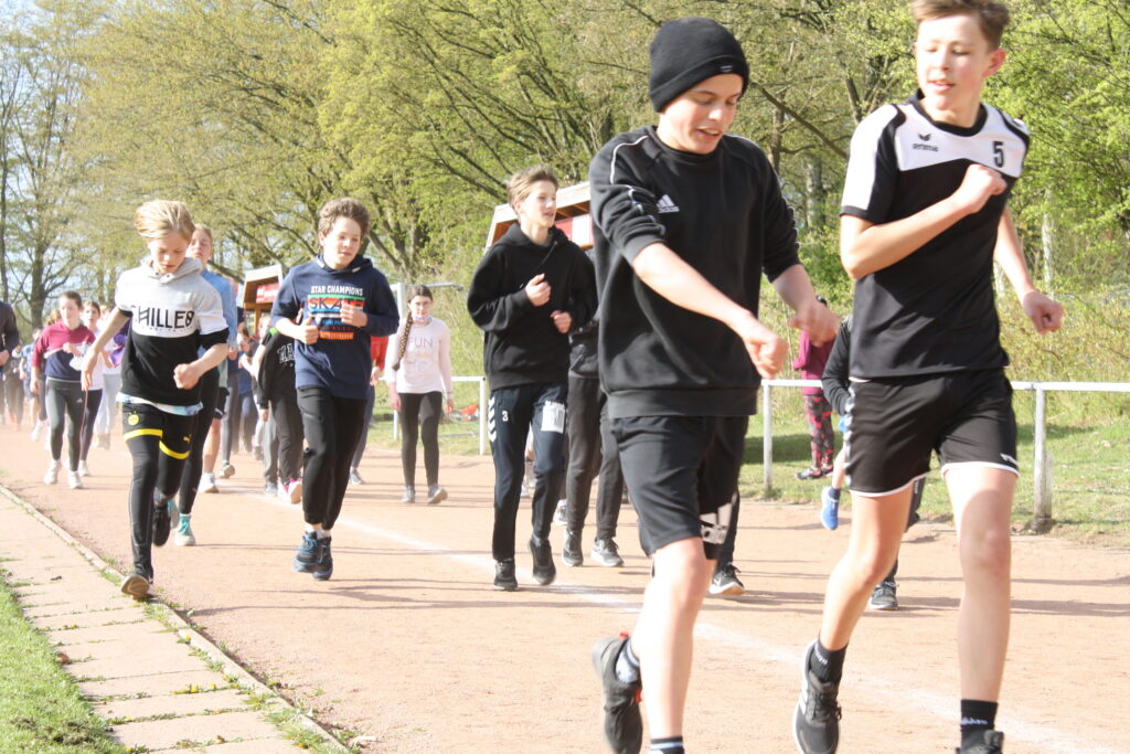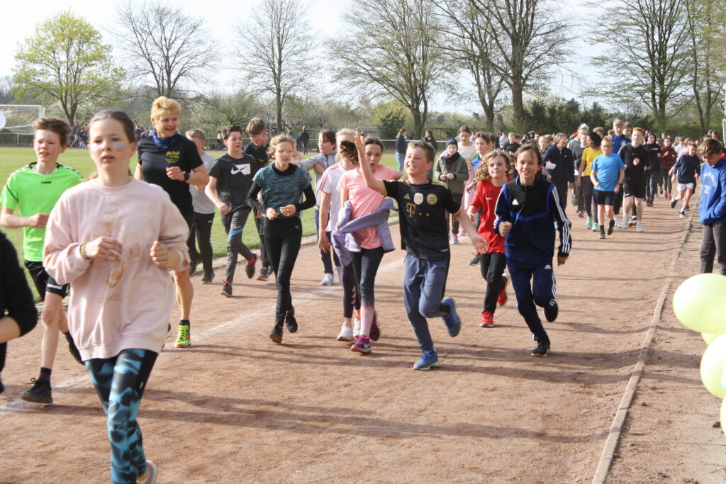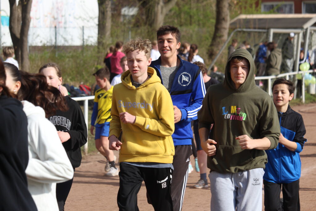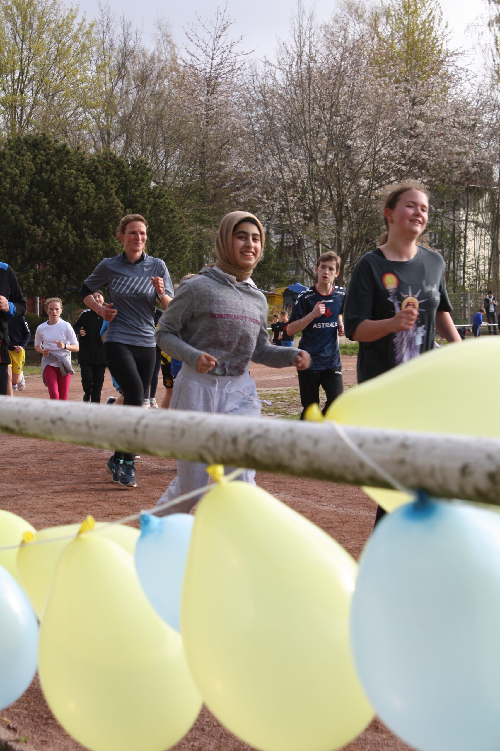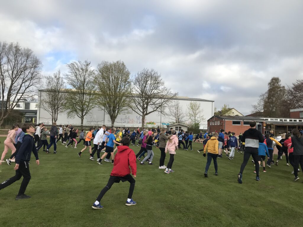 Zur Musik, die aus den Lautsprechern über den Platz schallt, setzen sich alle in Bewegung und drehen Runde um Runde um den Rasen. Angefeuert werden sie von Eltern, Lehrkräften und Mitschülern.