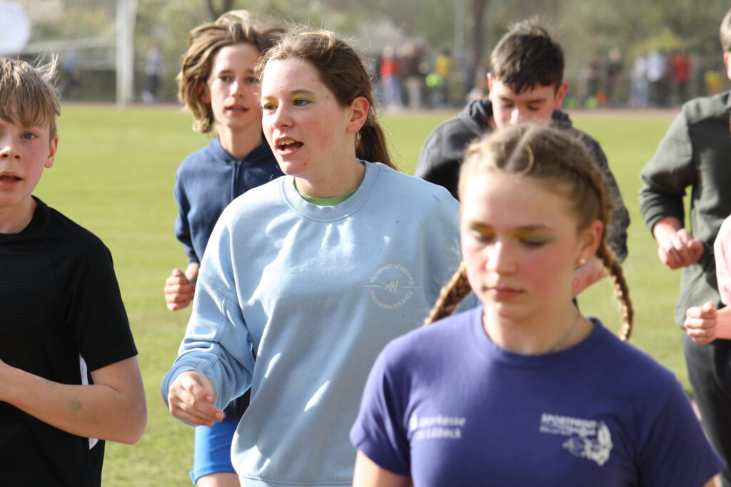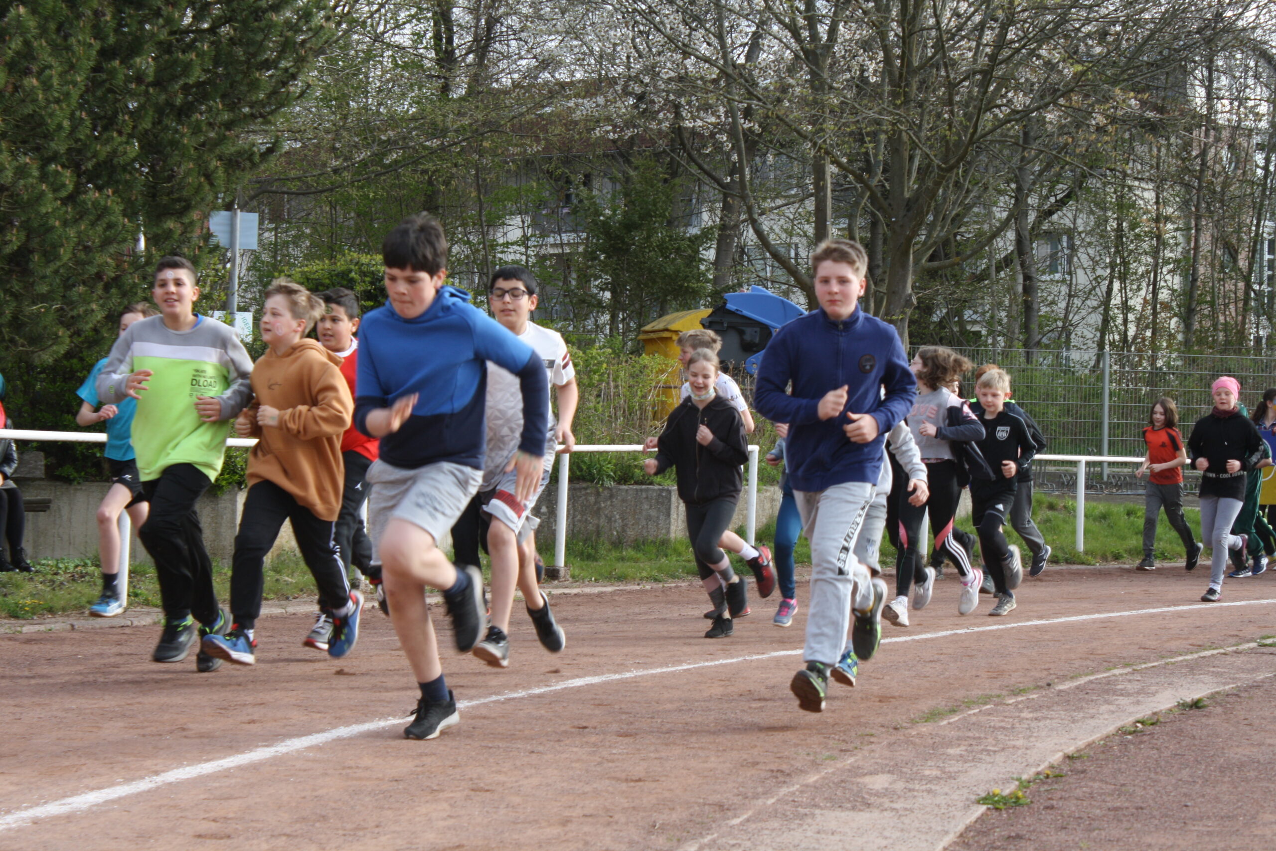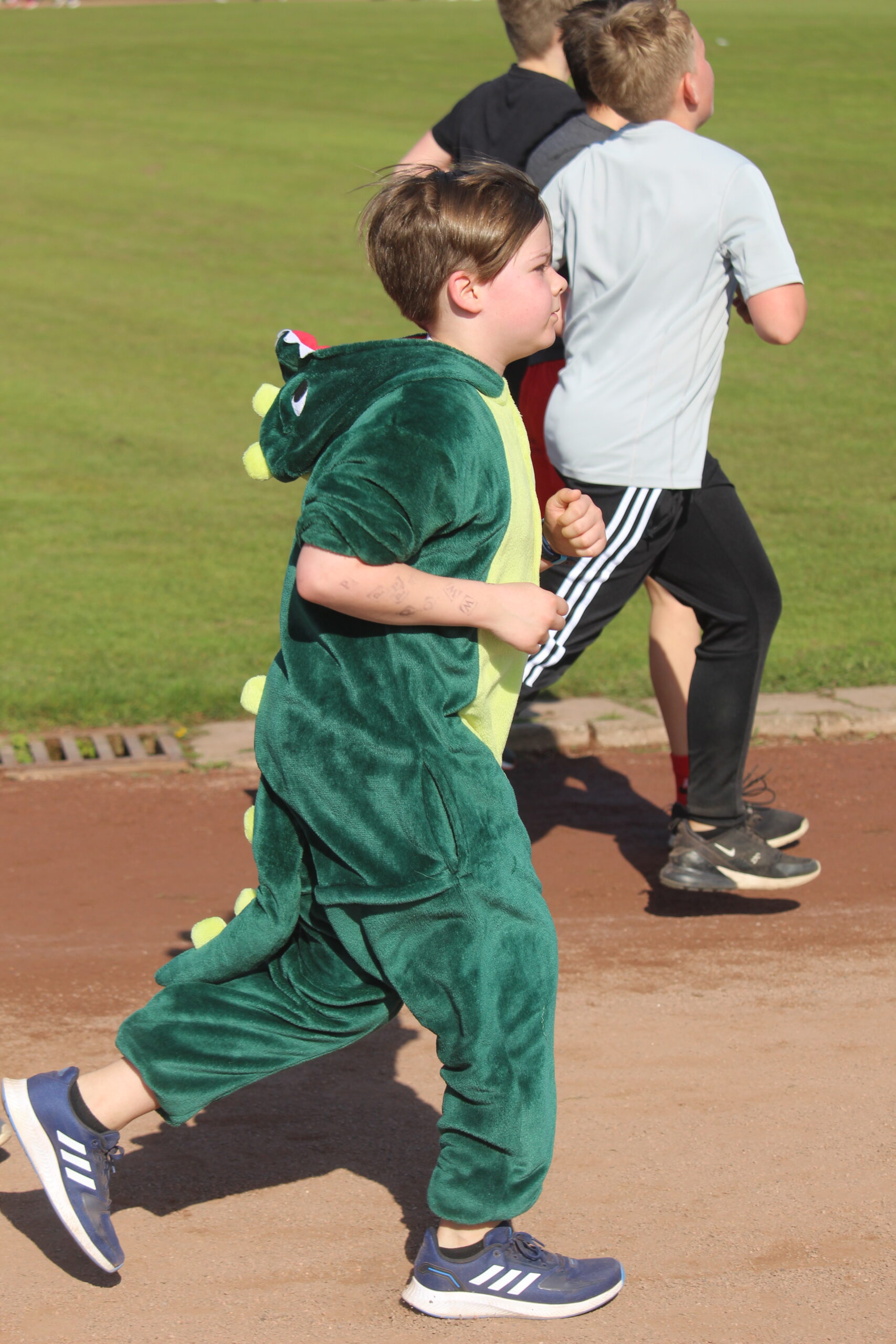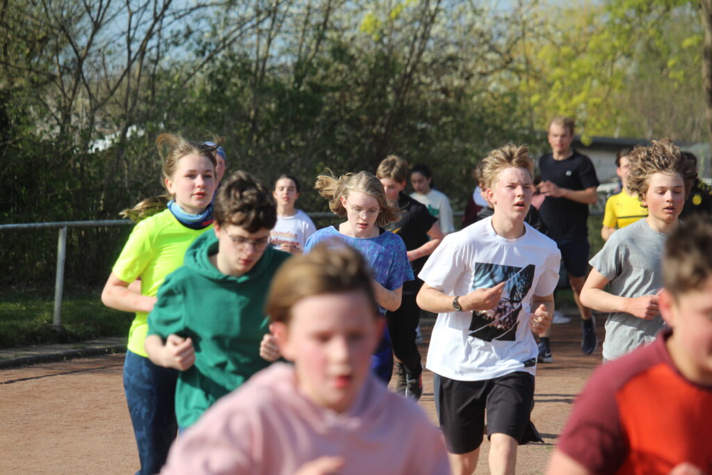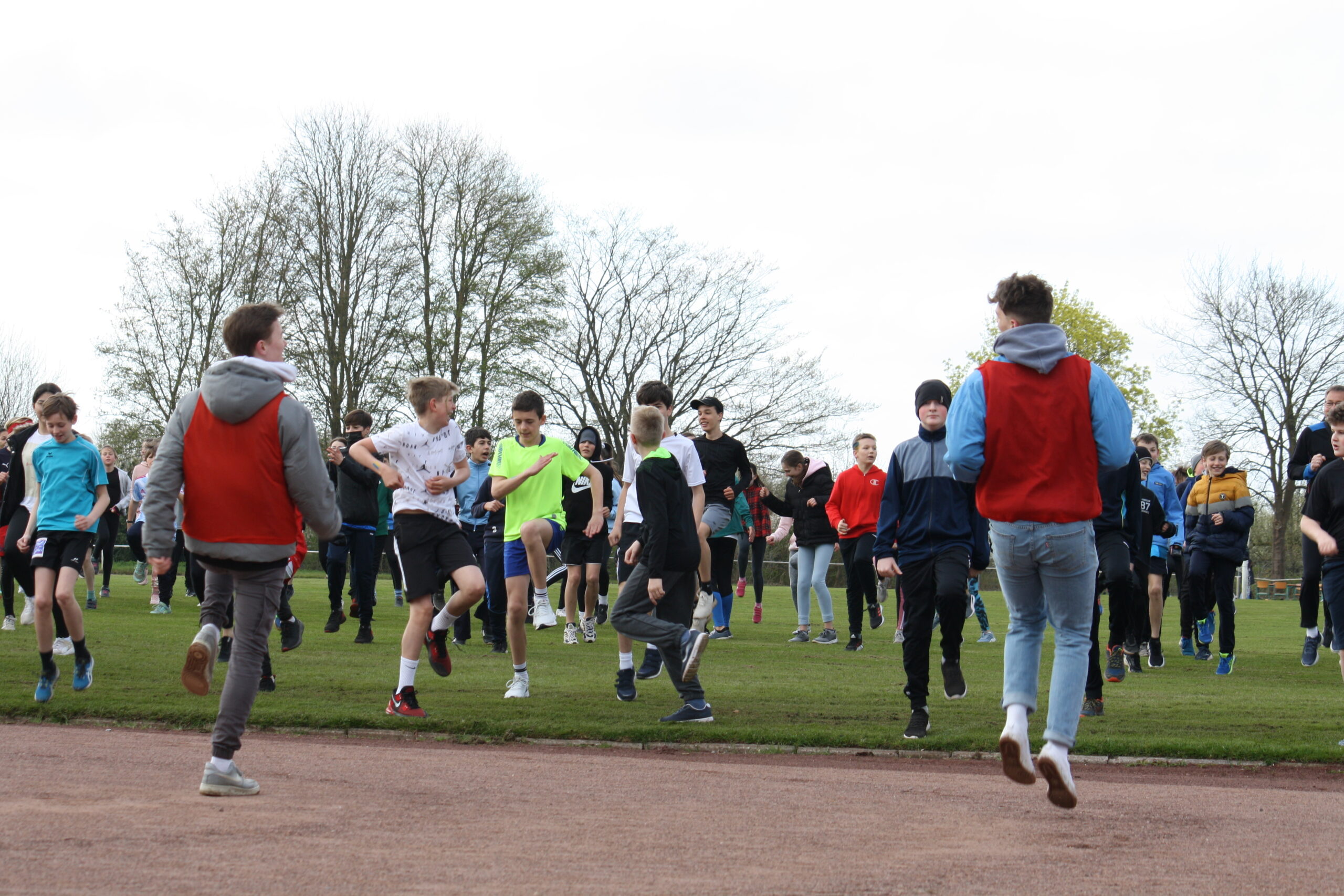 Zur Musik, die aus den Lautsprechern über den Platz schallt, setzen sich alle in Bewegung und drehen Runde um Runde um den Rasen. Angefeuert werden sie von Eltern, Lehrkräften und Mitschülern.