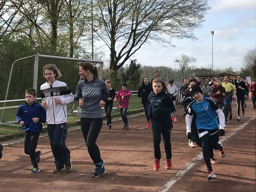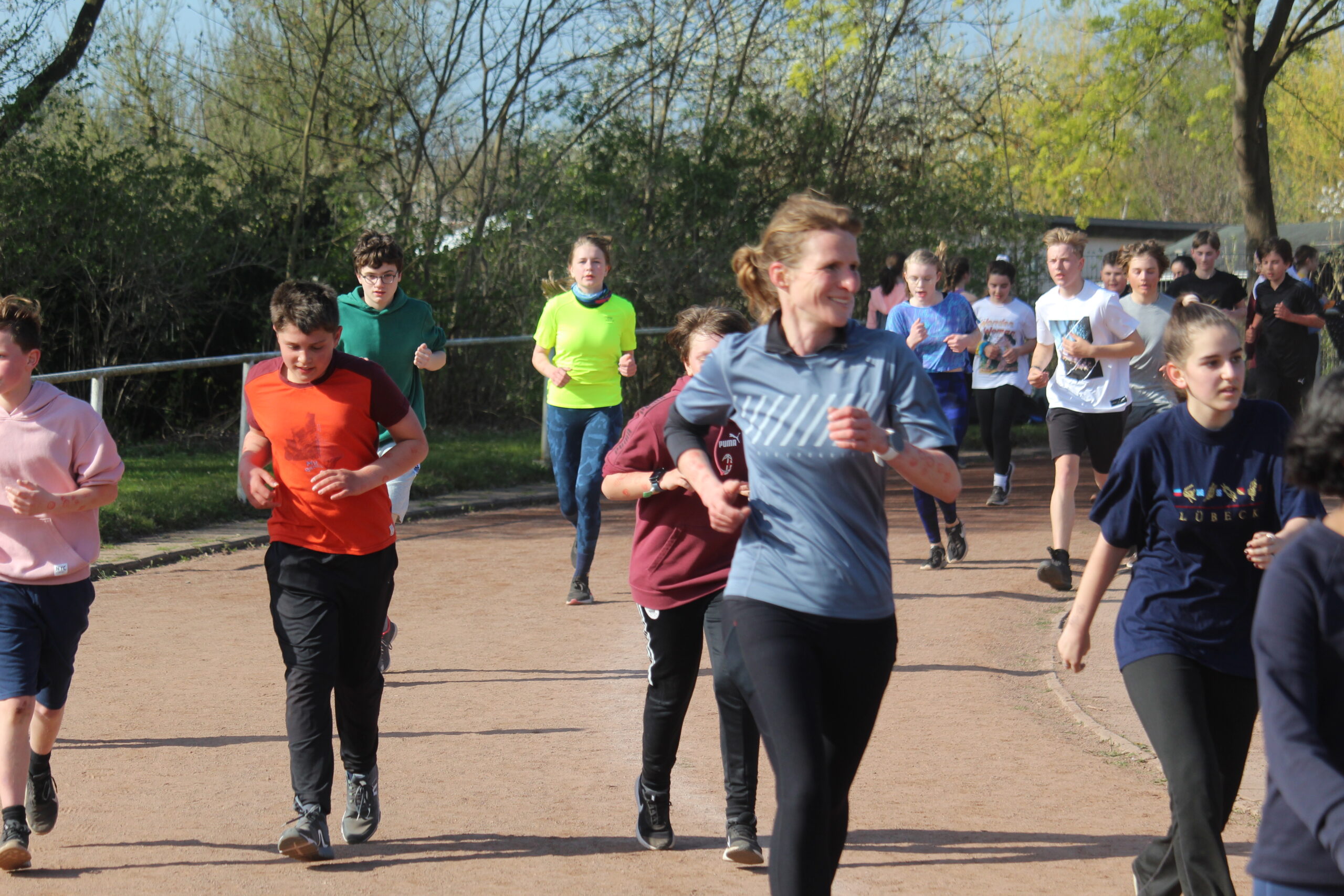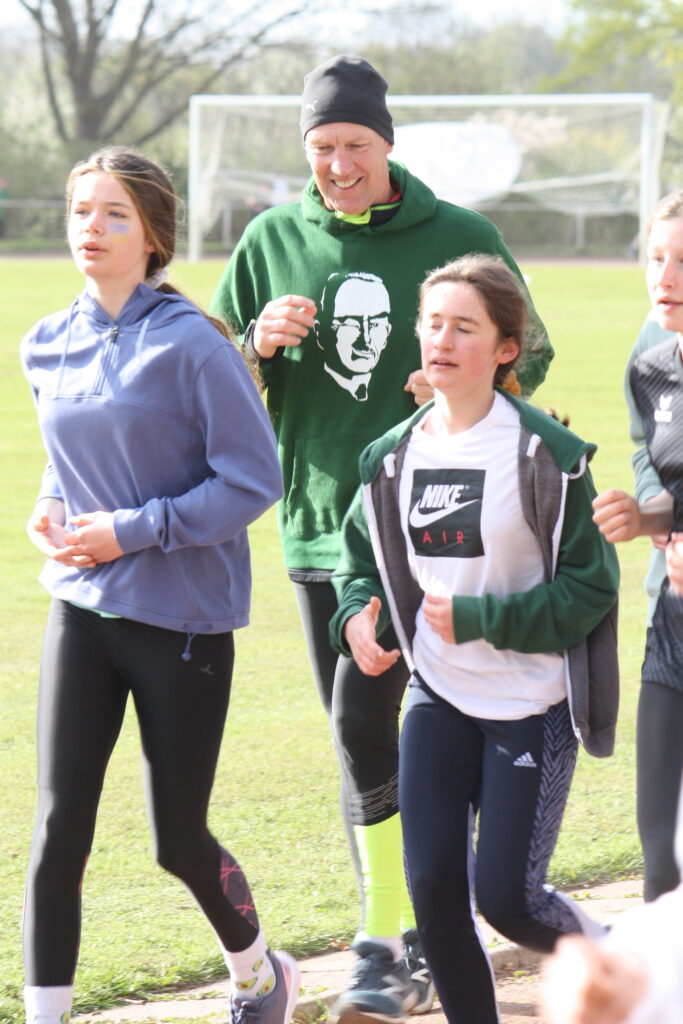 Auch Lehrkräfte traben um den Platz und motivieren durch ihr Beispiel die Schülerinnen und Schüler durchzuhalten, hier unser Schulleiter Dirk Rother.