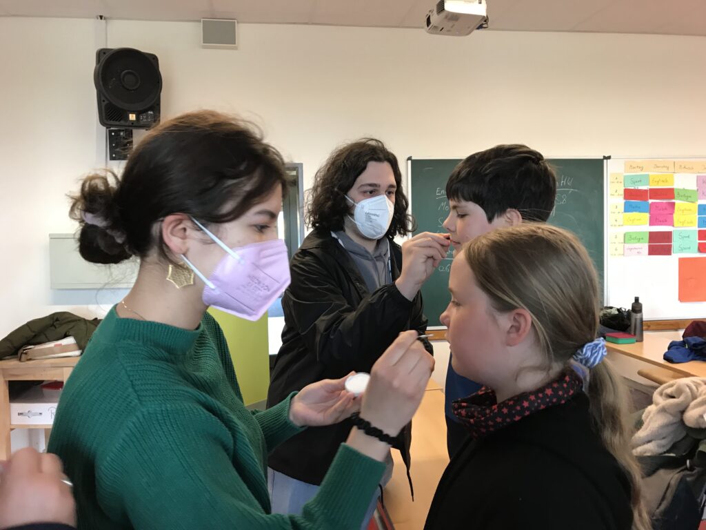 Um 8:30 Uhr finden sich die Schülerinnen und Schüler der Orientierungsstufe auf dem Rasen des Sportplatzes ein. Auf Stirn und Wangen tragen viele ein Peacezeichen in Schulfarben. Oberstufenschüler haben sie zuvor geschminkt.