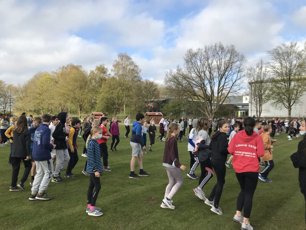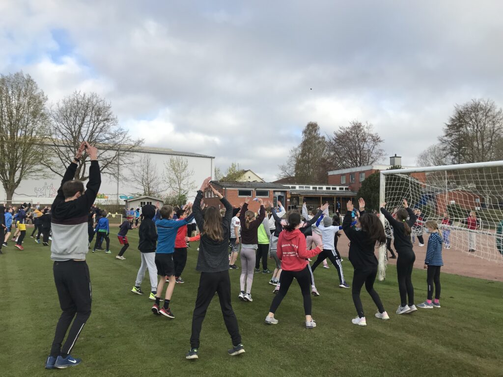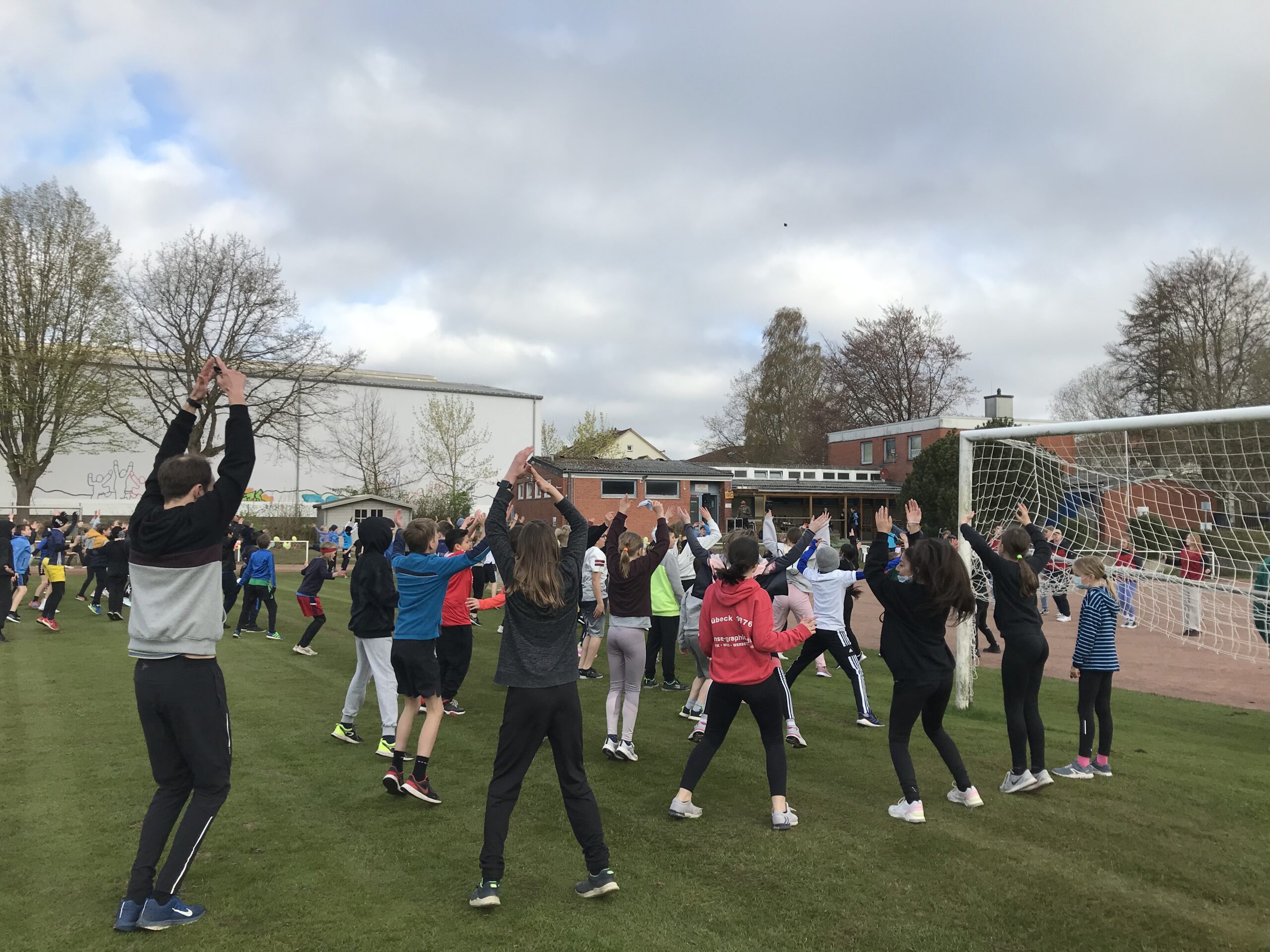 Dann beginnt das Aufwärmen. Die Schülerinnen und Schüler des Sportprofils machen die Übungen vor, über 200 Fünft- und Sechstklässler gehen mit.