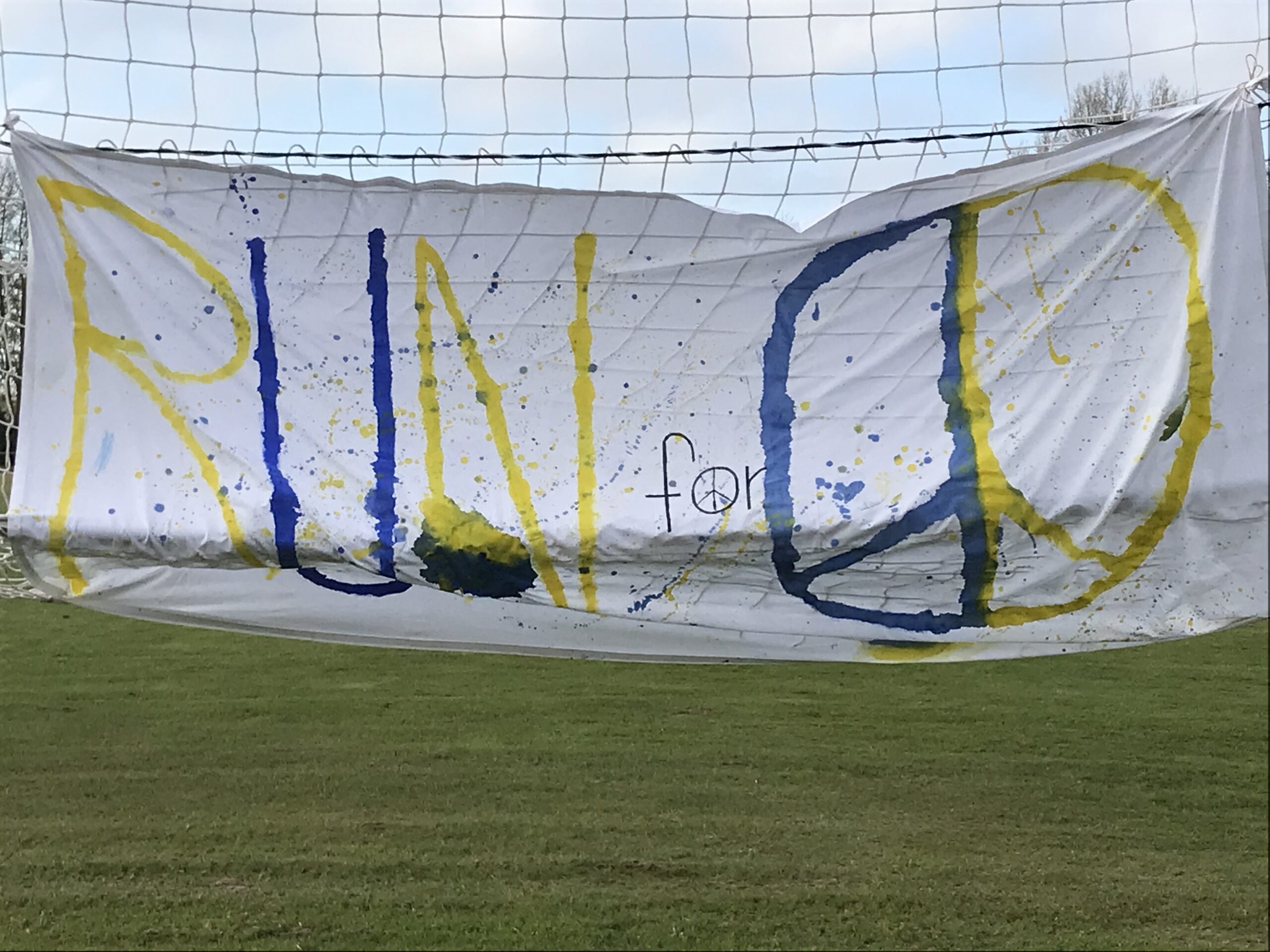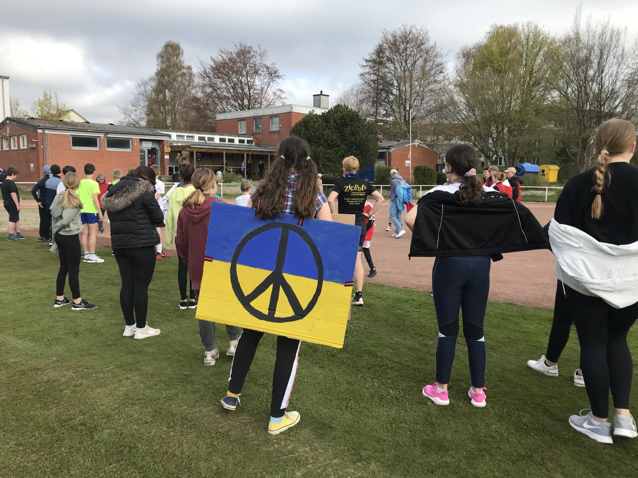 Auf dem Sportplatz geht ein frischer Wind. Banner in blau-gelb mit der Aufschrift „Run for Peace“ oder Friedenstaube bauschen sich in der Brise. Auf einem anderen können die Teilnehmer einen Friedensappell unterschreiben.