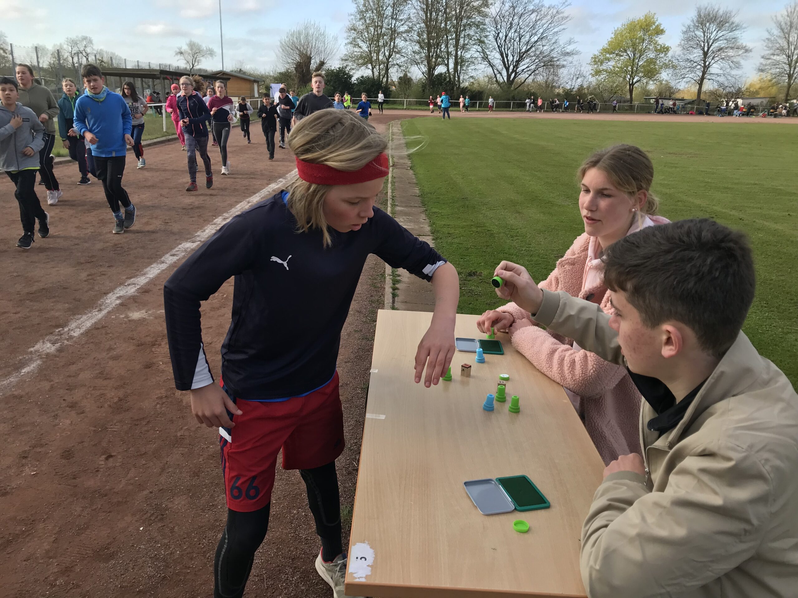 Knapp eine Stunde später steigen die Mittelstufenschüler ein. Richtig voll wird es auf den Bahnen, als etwas später auch die Oberstufenschüler hinzu kommen, denn unsere Jüngsten hören nicht einfach nach ein paar Runden auf. Sie laufen weiter mit und lassen sich – wie Piet – für jede Runde einen Stempel auf den Arm setzen.