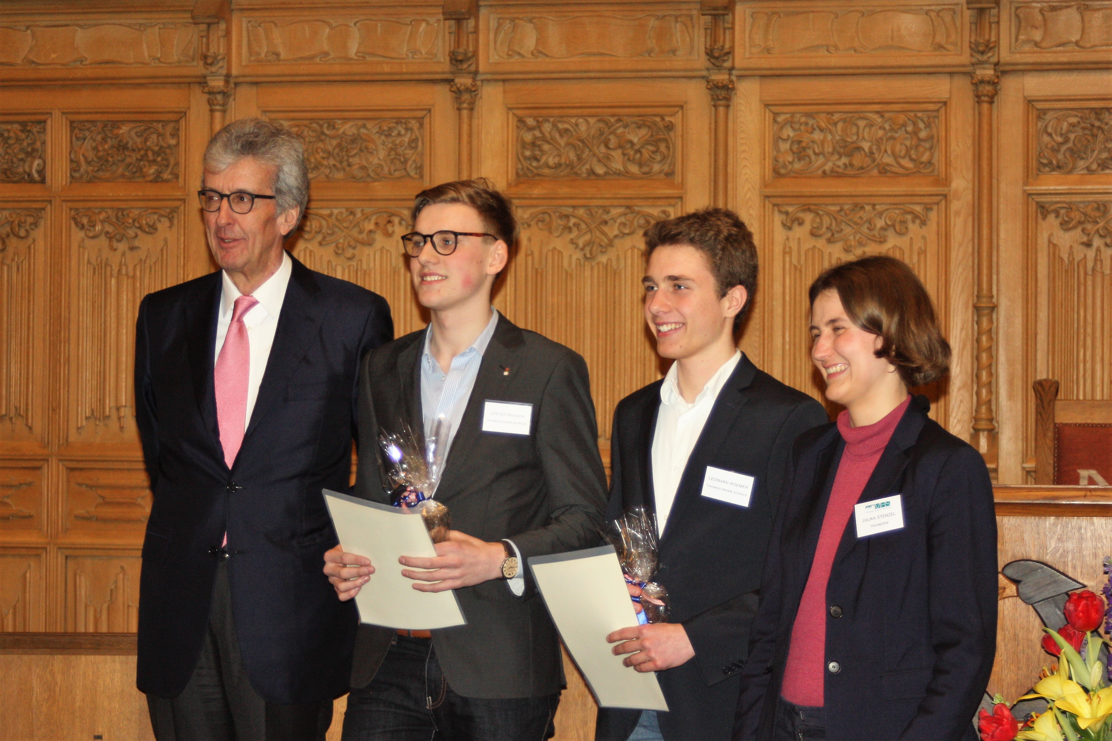 Michael Haukohl, Initiator und Stifter der Debattiermeisterschaft, mit den beiden Siegern und Trainerin Julika Stenzel