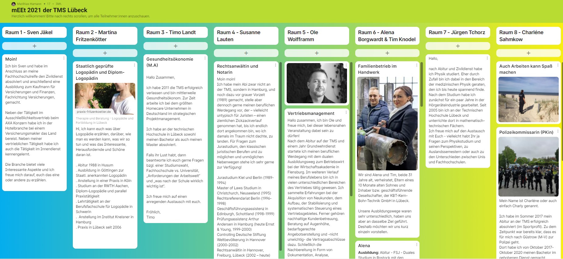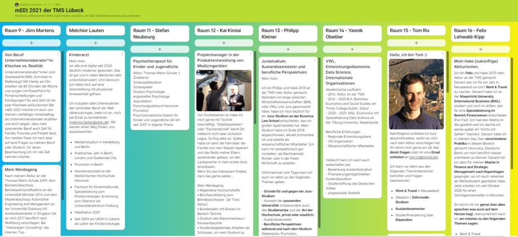 Unser Ziel ist, ein erstes niedrigeschwelliges Kennenlernen der Berufswelt zu ermöglichen – unter Einbeziehung der Schulgemeinschaft. So standen Eltern, aber auch viele ehemalige TMSler an diesem Abend zur Verfügung, um dem E-Jahrgang Fragen zu beantworten und Einblicke in ihren Berufsalltag zu geben. 15 Videoräume mit „offenen Türen“, 1,5 Stunden Zeit – es wurde ein abwechslungsreicher und zum Teil sehr unterhaltsamer Abend. Viele Ehemalige loggten sich aus dem Ausland ein, viele Eltern direkt aus ihren Arbeitszimmern: Rechtsanwalt, Polizistin, Fachärzt:innen, Psychologen, Kernbohrer, Unternehmer, VWL/BWL und Schauspieler waren unter anderem vertreten. Manch einer bedauerte, dass er nicht in jeden Raum hineinhorchen konnte und dadurch viel verpasste.