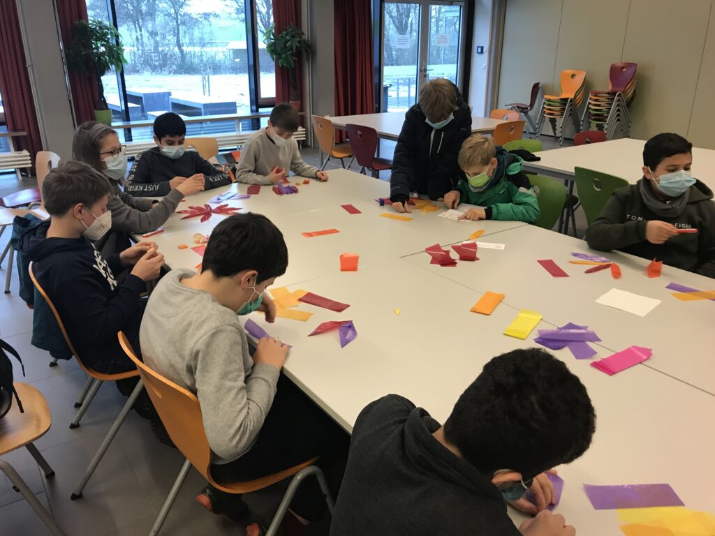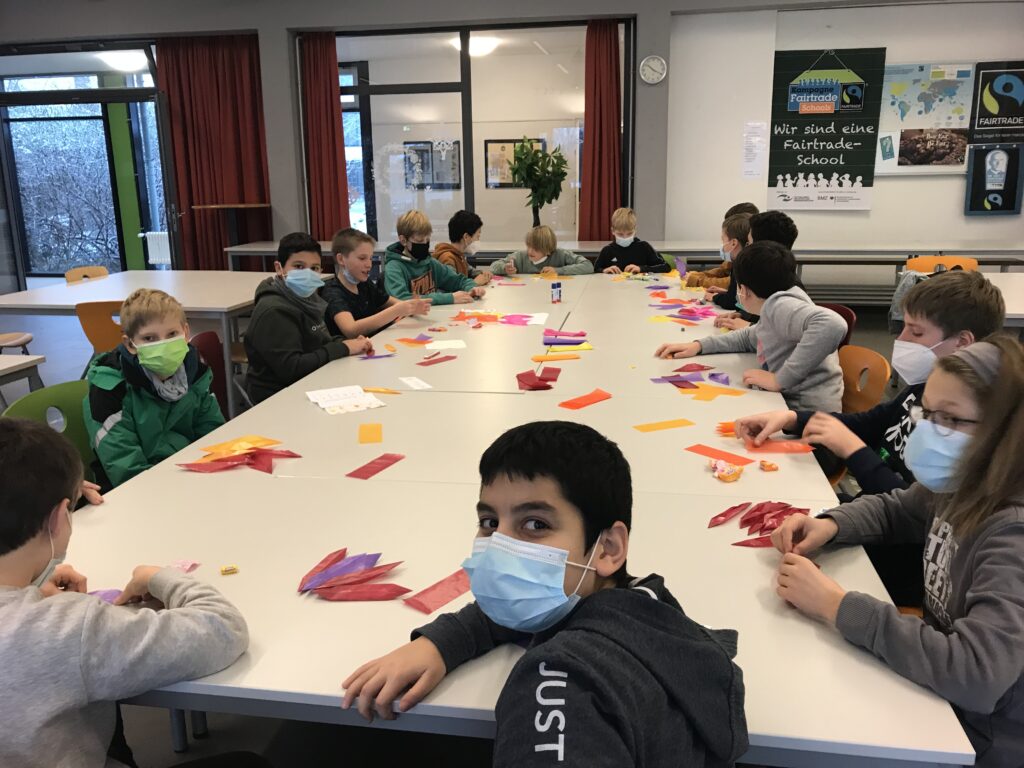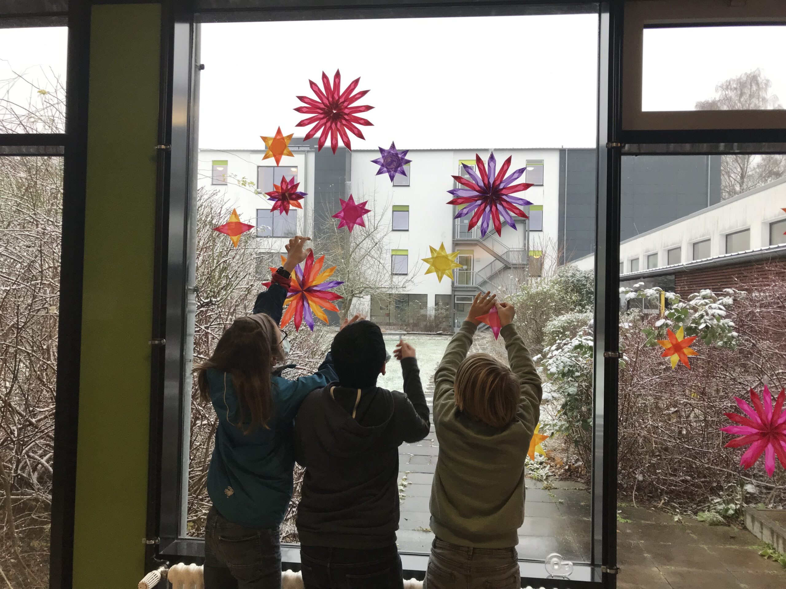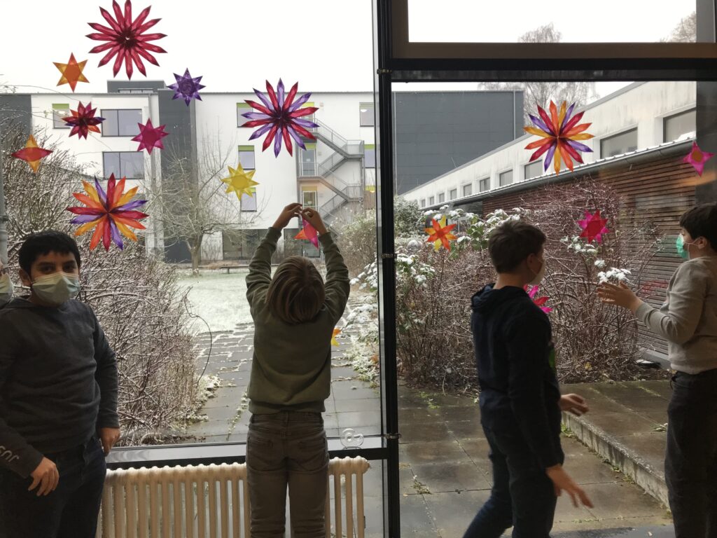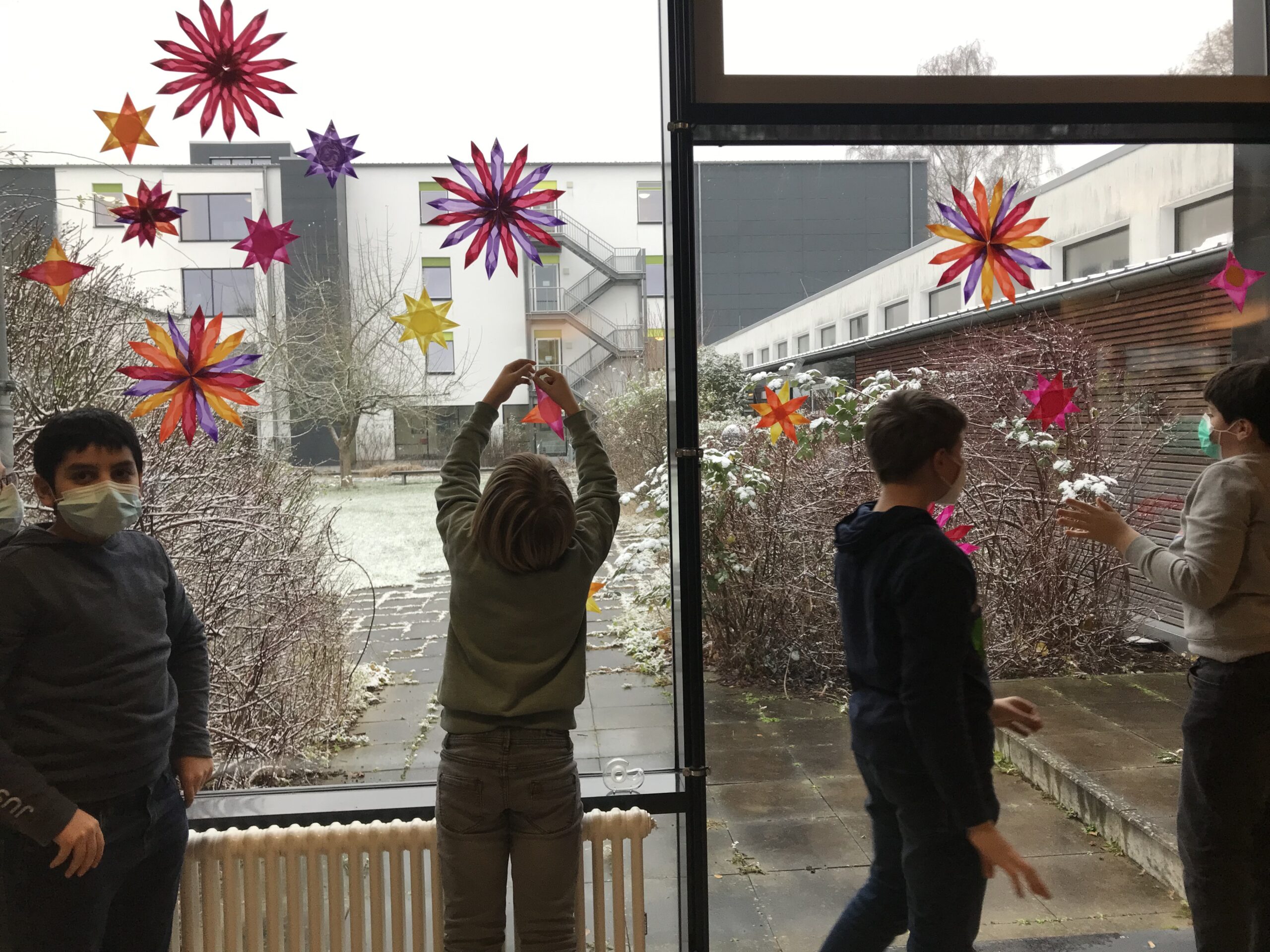 Einen Beitrag für die Gemeinschaft wollten sie leisten, die 17 Jungen der Klasse 5d. In geduldiger Feinarbeit falteten sie aus Transparentpapierstreifen Zacken für farbenfrohe Sterne, die im Gegenlicht des Mensaflurs uns entgegenleuchten.