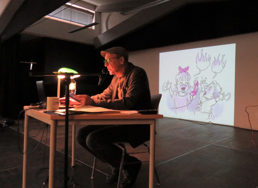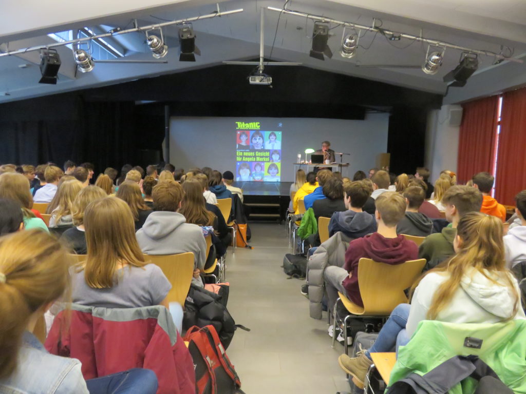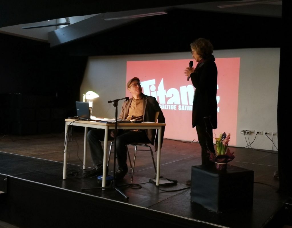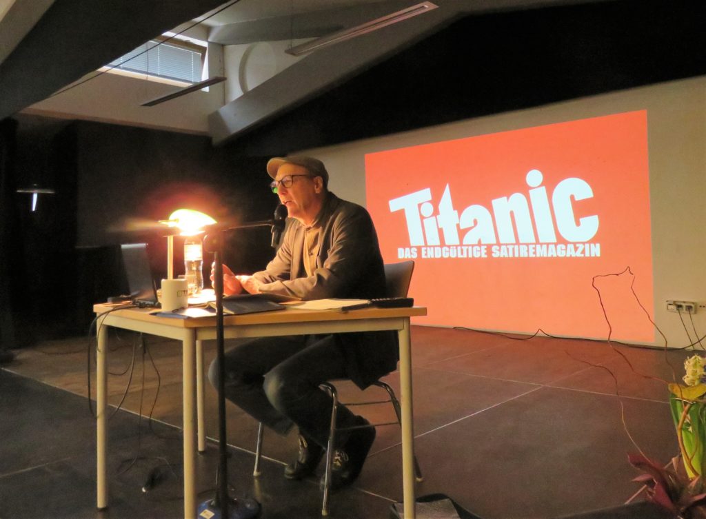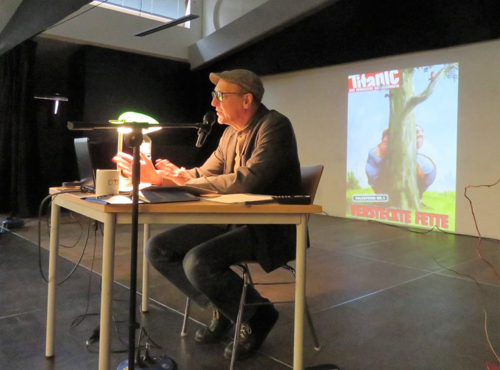 Verschmitztes Lächeln provozierte der ehemalige Chefredakteur der „Titanic“ bereits zum Auftakt der Veranstaltung mit einigen Titelseiten des Satiremagazins. Gleich darauf zog Gsella, der bereits seit 40 Jahren hauptsächlich komische Gedichte verfasst, alle Register der Reim- und Klischeekunst und mit ihr erst einmal gegen die Lehrerzunft zu Felde.