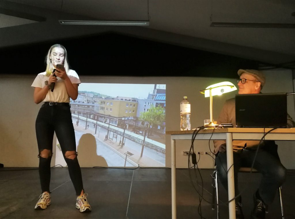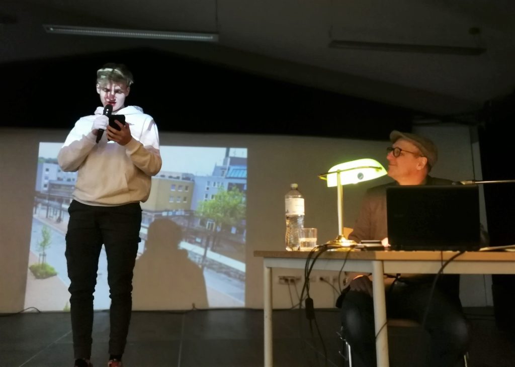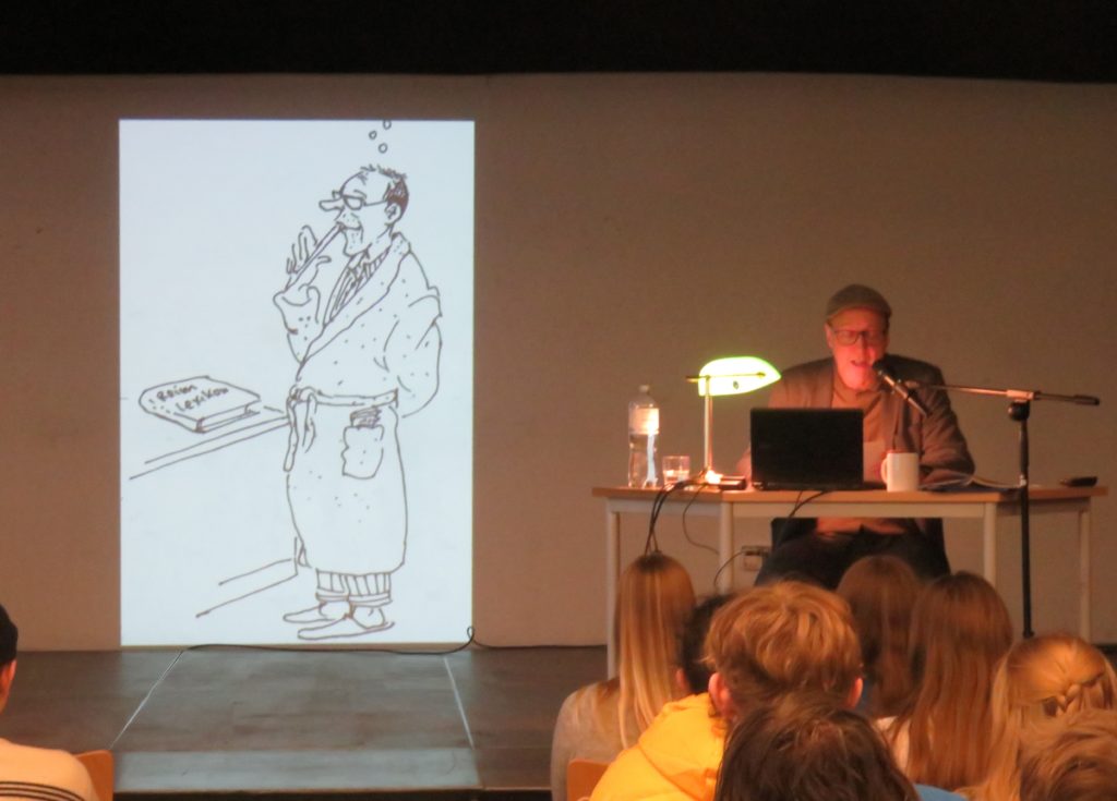 Nach einigen Kostproben seiner Schmähgedichte auf deutsche Städte sind dann die Schülerinnen und Schüler selbst an der Reihe. Im Handumdrehen entstehen Zwei- oder Vierzeiler zu Lübeck, in denen – wie der Dichter anerkennend feststellt – „wahre Heimatliebe“ ihren lyrischen Ausdruck findet mitsamt allem, was die Stadt zu bieten hat: blasiertem hanseatischen Stolz, Buntekuh und lübscher Piefigkeit – am Ende ertönt gar ein freimütiges Liebesbekenntnis zu Kiel.