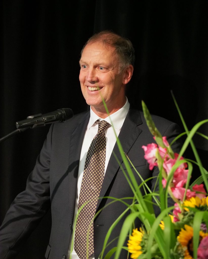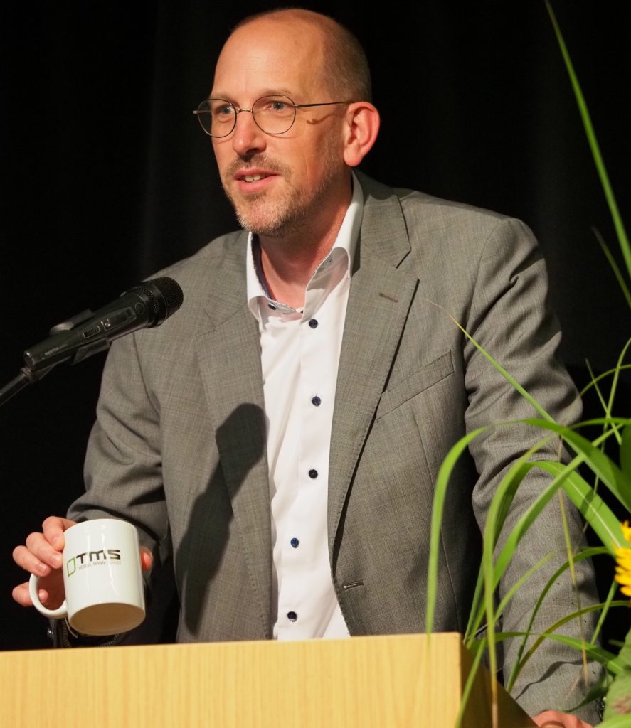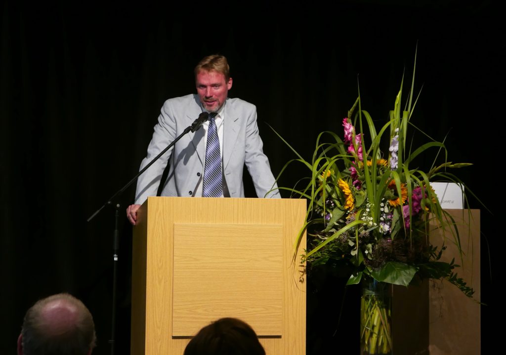 Mit Spannung erwartet, ergriff Dirk Rother am Ende der Veranstaltung selbst das Wort. Einen herzlichen Dank richtete er zunächst an alle, die zu der Feier beigetragen hatten. Dann skizzierte er, warum er sich für die Thomas-Mann-Schule beworben habe. Es sei weniger die humanistische Ausrichtung, die der Namensgeber signalisiere, als die internationale Ausrichtung der TMS, die ihn gereizt habe. Schülerinnen und Schüler auf eine globalisierte Welt vorzubereiten, sei eines seiner zentralen Anliegen.