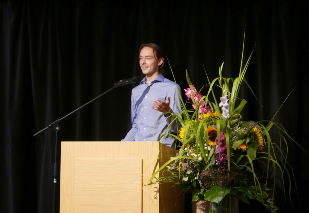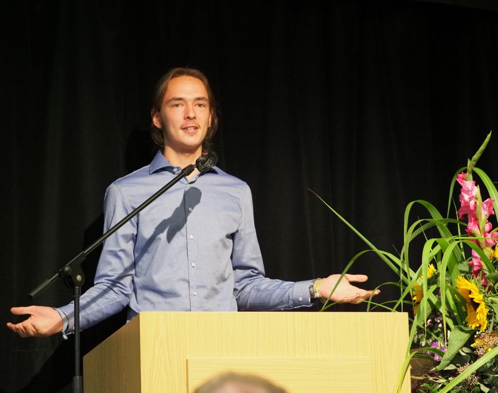 Äußerst lebendig schilderte Schülersprecher Jan Rahlf viele besondere Momente, die für ihn die TMS ausmachen. SV-Mitglieder, die bis nachts an Weihnachtsüberraschungen basteln, oder dass er ohne Vorkenntnisse zum Debating-Club gegangen sei. Dort sei er auf Ältere getroffen, die ihm alles Wichtige beibrachten. Er habe an unserer Schule gelernt, dass keine Frage als dumm abgestempelt werde und man sich um einander kümmere. Dafür liebe er die Schule. Jan wünschte Herrn Rother viele solcher Erfahrungen. Wenn er seine Wünsche zusammenfassen solle, dann dass Herr Rother Spaß an seiner Tätigkeit habe.