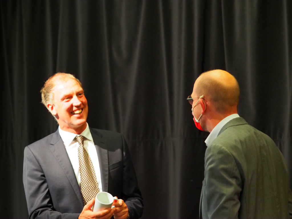 Der Sprecher der Lübecker Gymnasien, Michael Janneck, hatte „Küchenarchäologie“ betrieben, wie er gut gelaunt berichtete. Er vermachte Dirk Rother einen von drei TMS-Kaffeebechern, die er in seiner eigenen Zeit als Lehrer an der TMS erworben hatte. Dieser sei selbstverständlich desinfiziert, fügte er mit einem Augenzwinkern an.